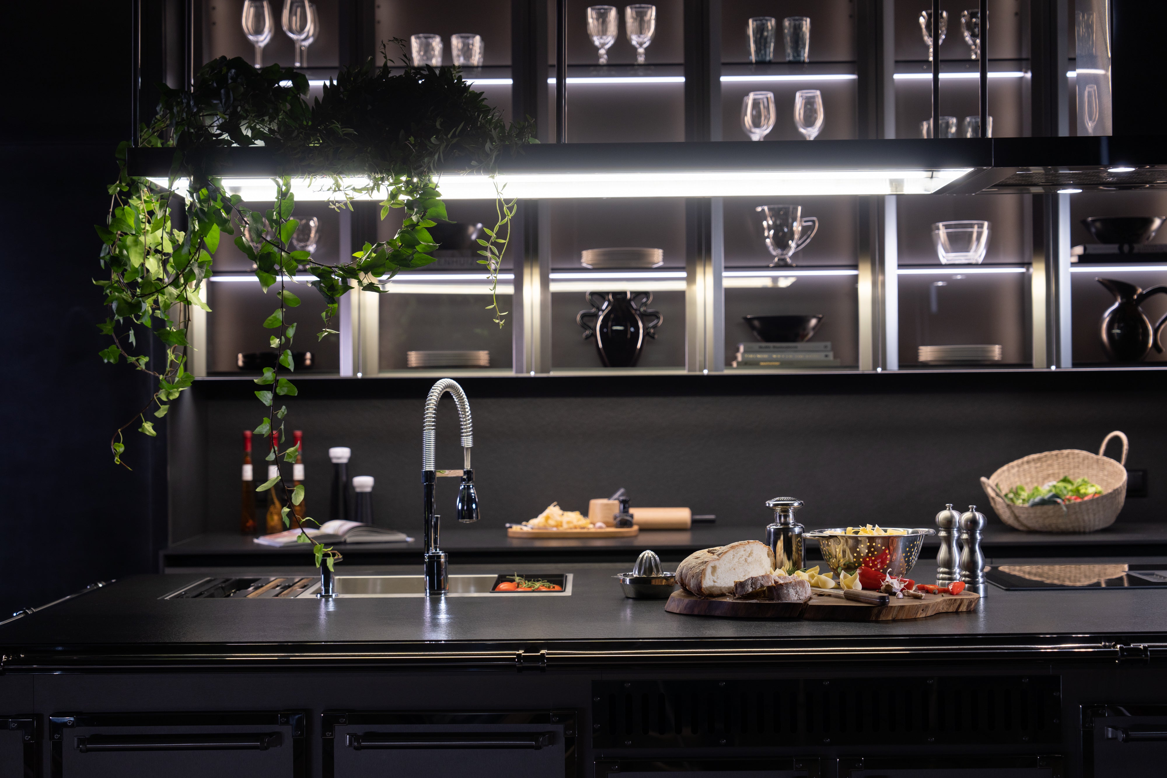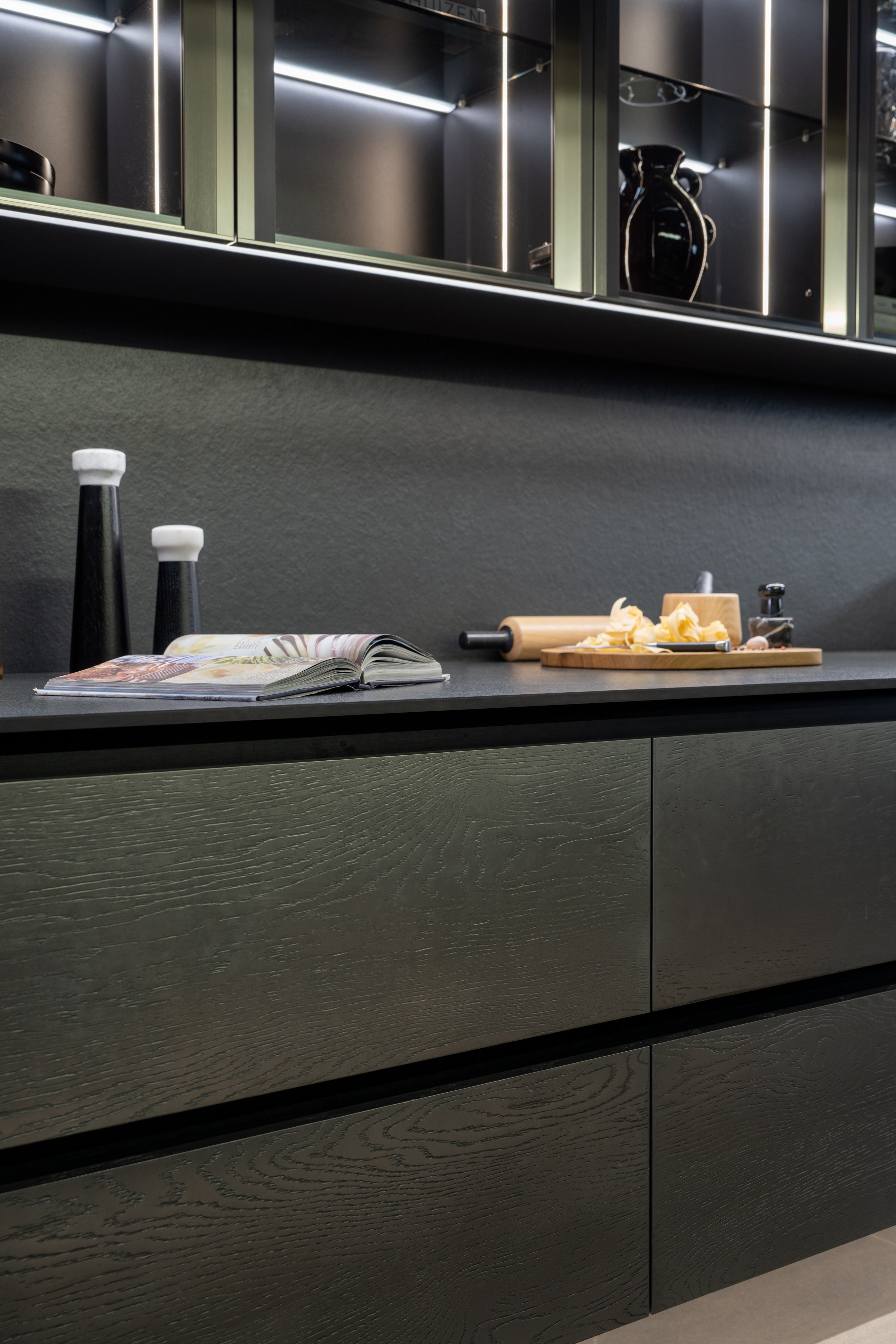 The palette is restrained, because this is a place for your culinary expression. Veneered fronts coated with liquid metal, MDF fronts with stainless steel sheet, porcelain stoneware countertops that can be used for hot dishes – this is a kitchen you can trust. Glass and backlit fronts add lightness and balance.