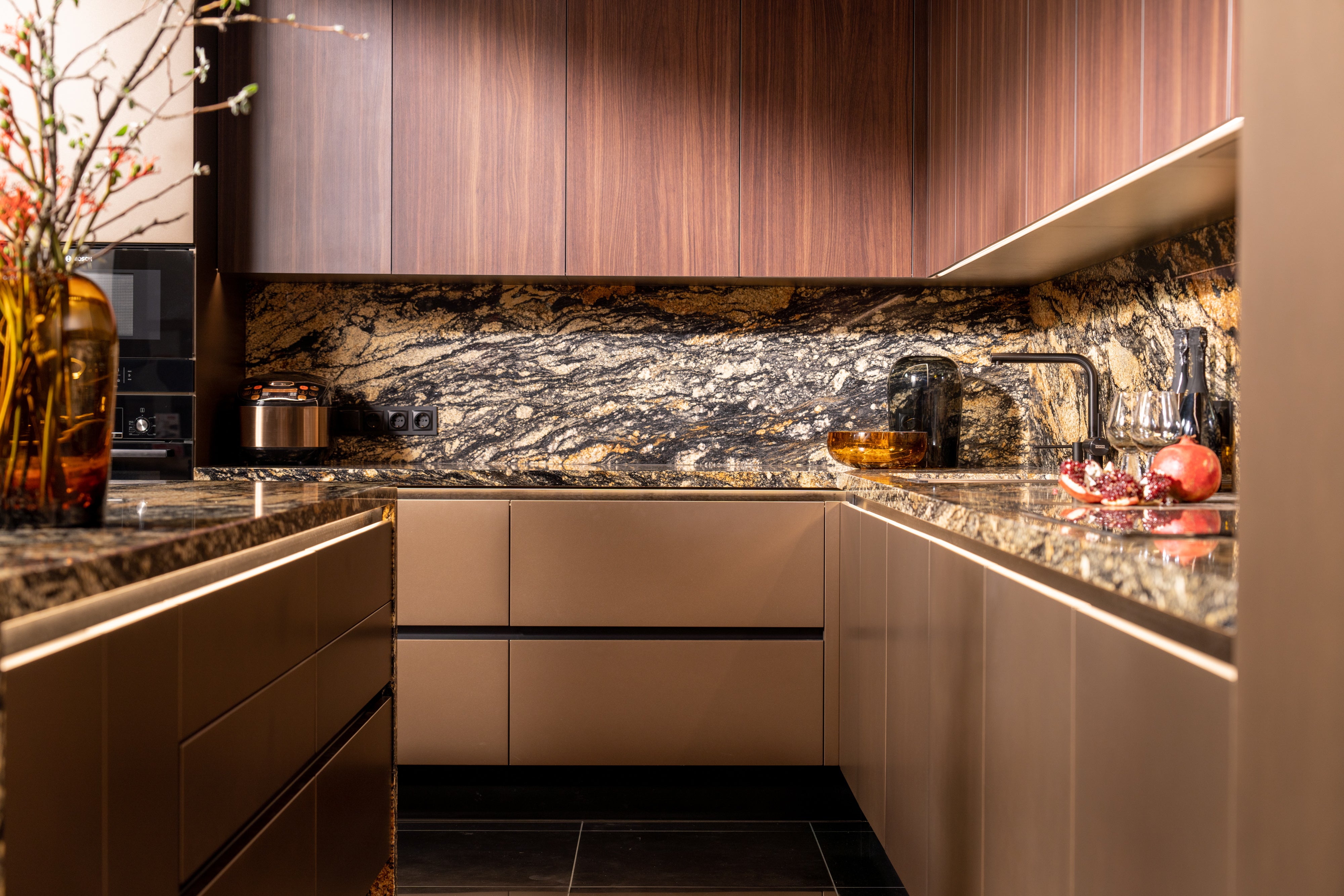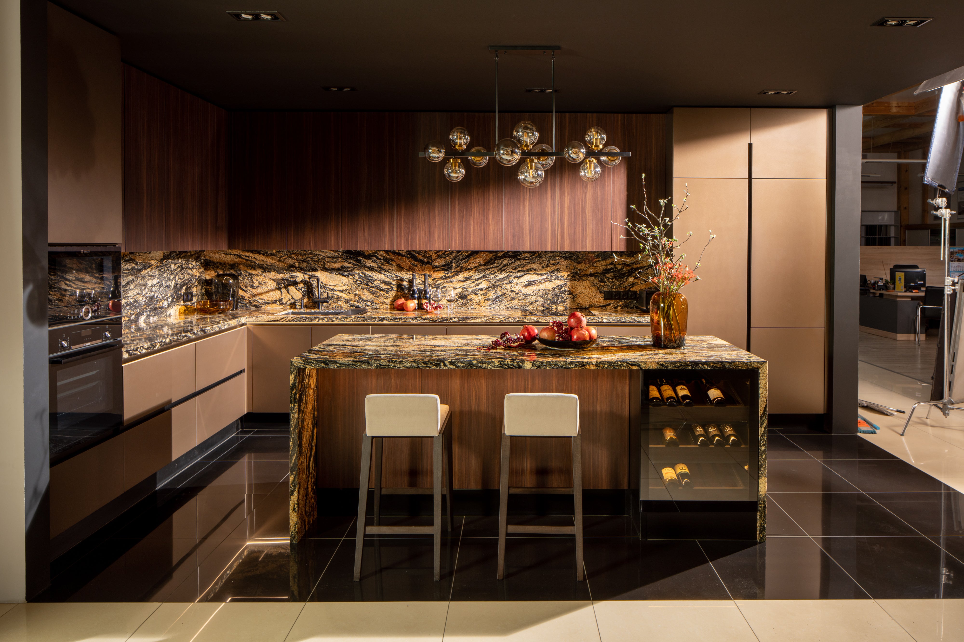 This magnetic kitchen set will also be in the spotlight. The first thing that catches your eye is the natural Magma Gold stone. This is an exotic granite originally from Brazil. Gold veins on a black background are a bold, daring pattern. The countertop, apron and kitchen island with a color that has something predatory about it. A living piece of nature in your home.