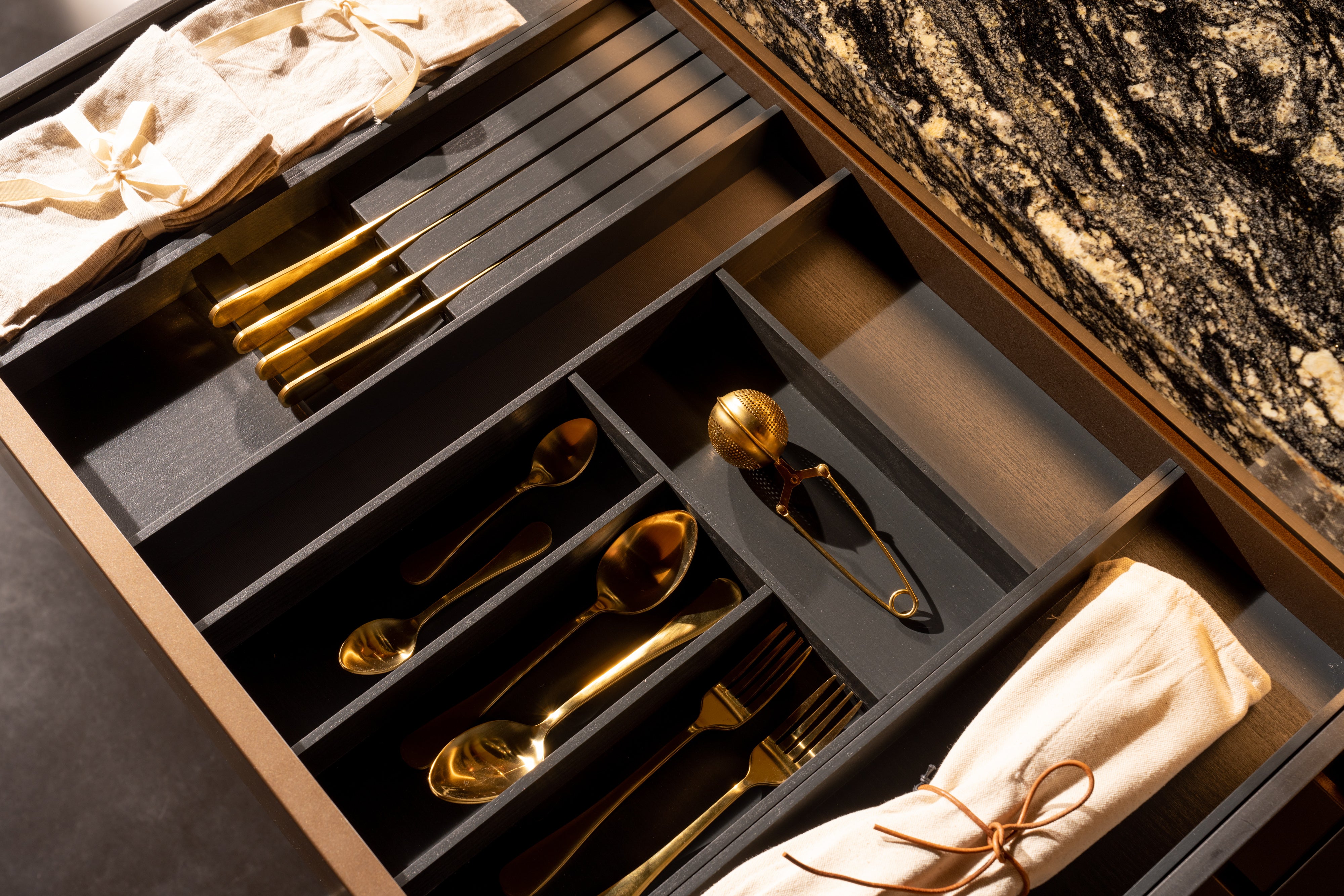The fronts are made of dark-core compact board. This is an ideal material in terms of stability, which is the embodiment of technological efficiency. The black profiles used instead of handles emphasize the clean lines of the set. To open the fronts without handles, we installed a Gola profile with illumination. Use the sensor to control the lighting and its intensity – depending on the time of day or mood.