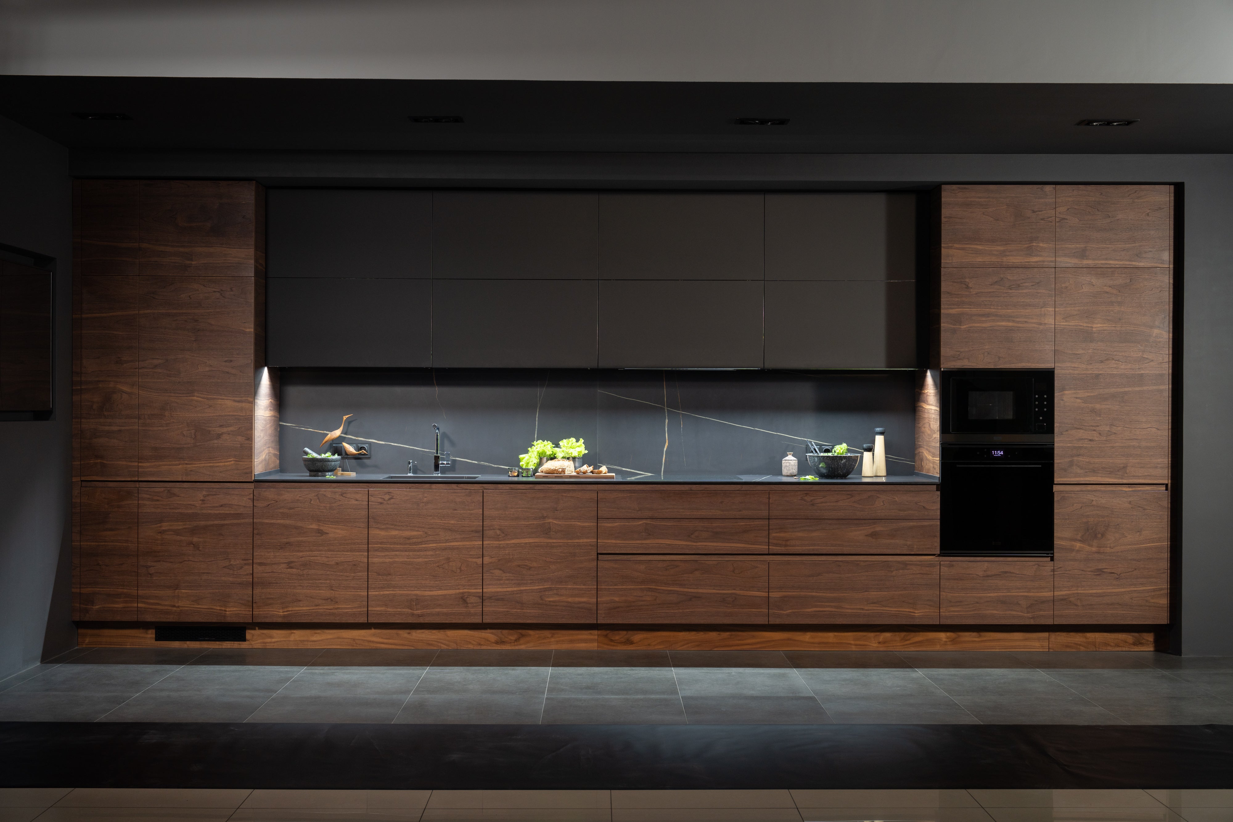 The worktop and wall panels are made of porcelain stoneware: white and orange lines on a black background emphasize the naturalness of the interior.