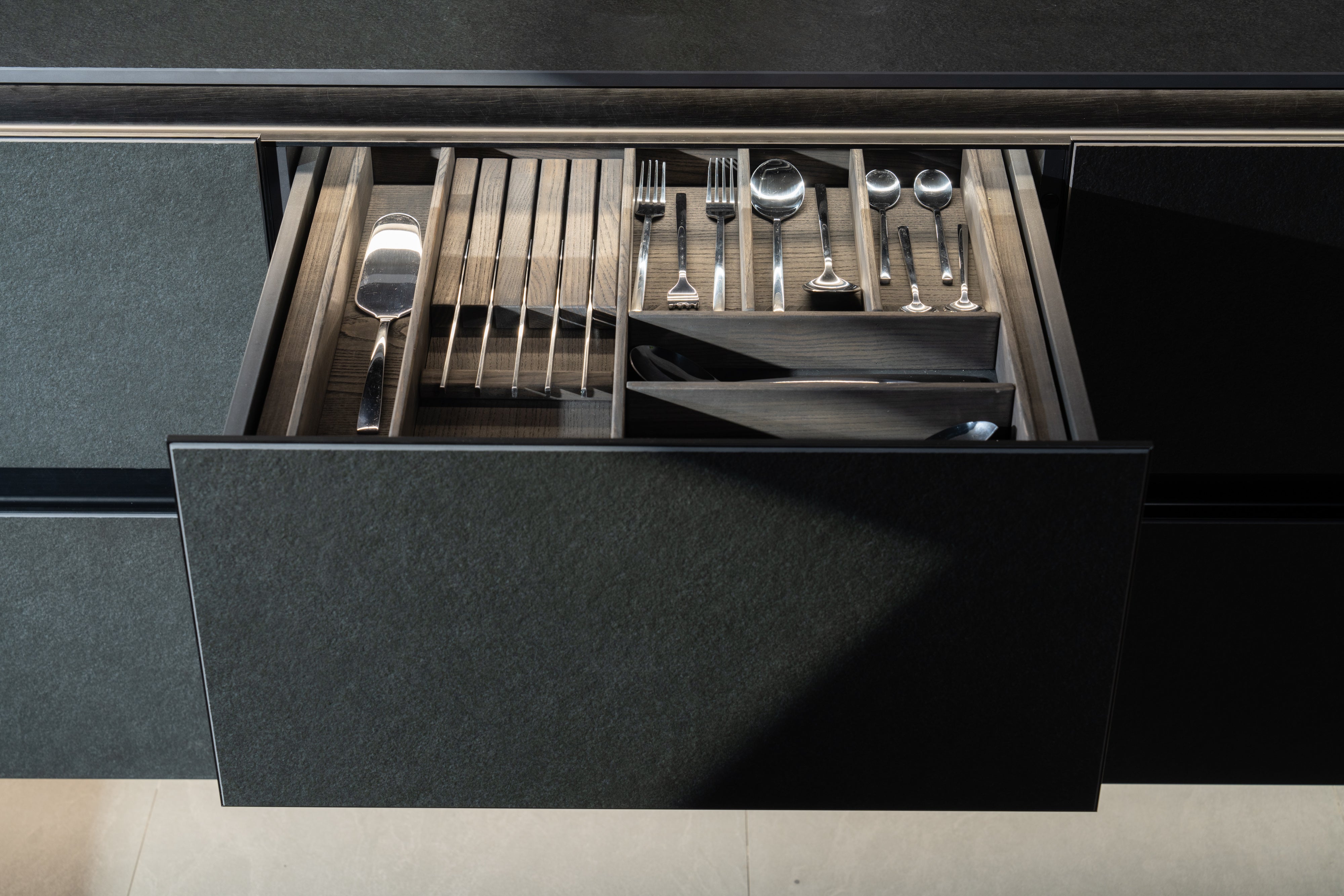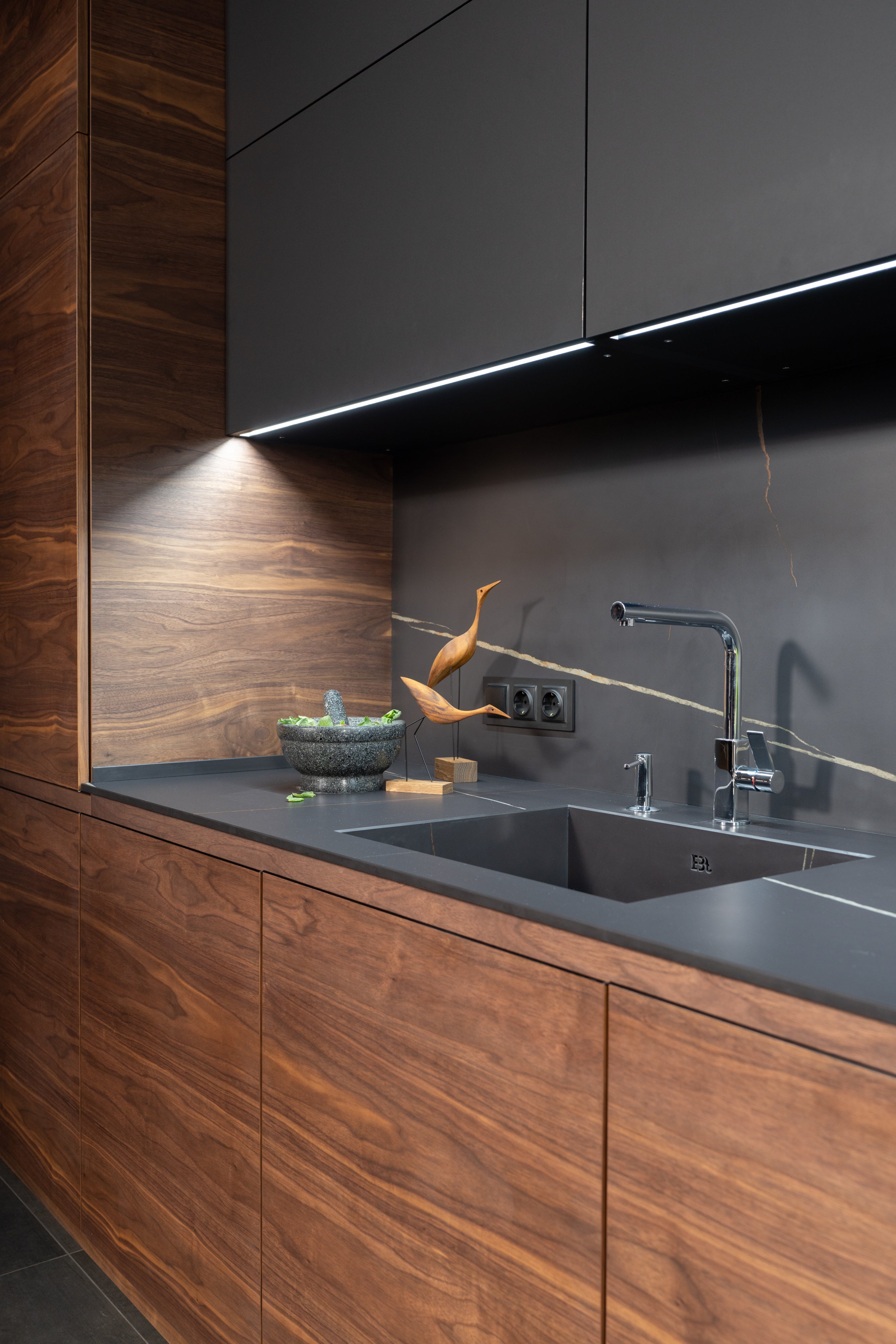 This set is an example of a combination of wood and modern technological materials – porcelain stoneware and HPL Fenix. HPL panels have a pleasant velvety surface and the ability to regenerate in case of damage. Shallow scratches can be easily removed from the surface under the influence of heat.
