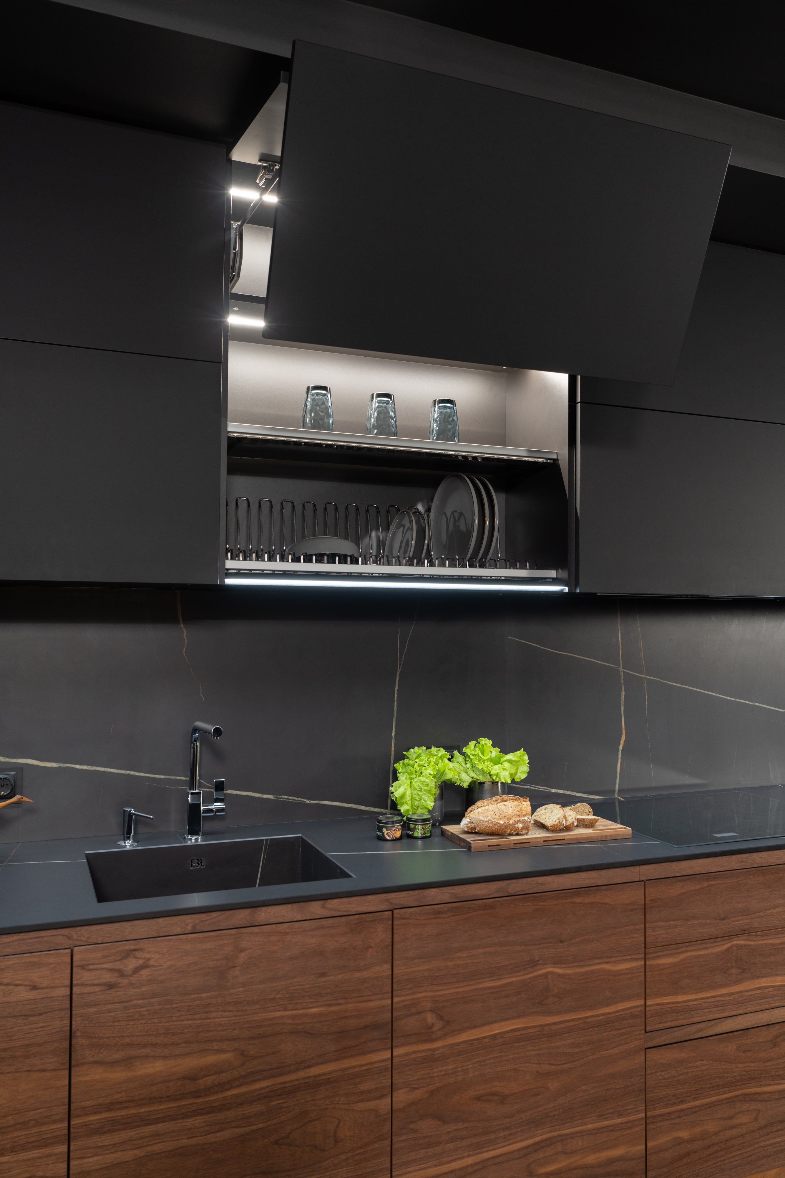 This kitchen is the embodiment of naturalness and authenticity! And all these is thanks to natural materials. The design is dominated by walnut wood. The texture of this wood is one of the most exquisite. Due to the smooth transition of the texture, the impression of integrity and perfection is achieved.