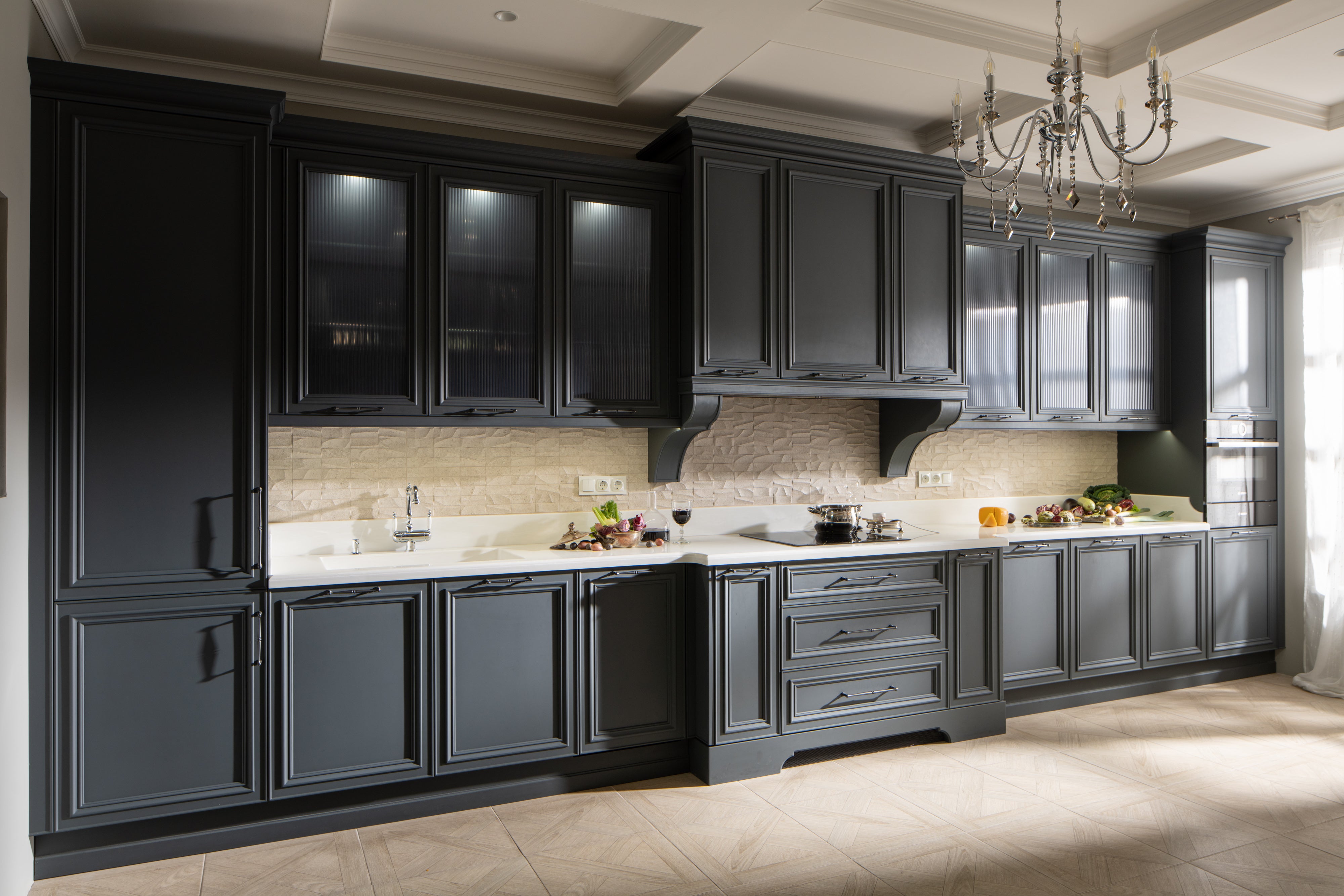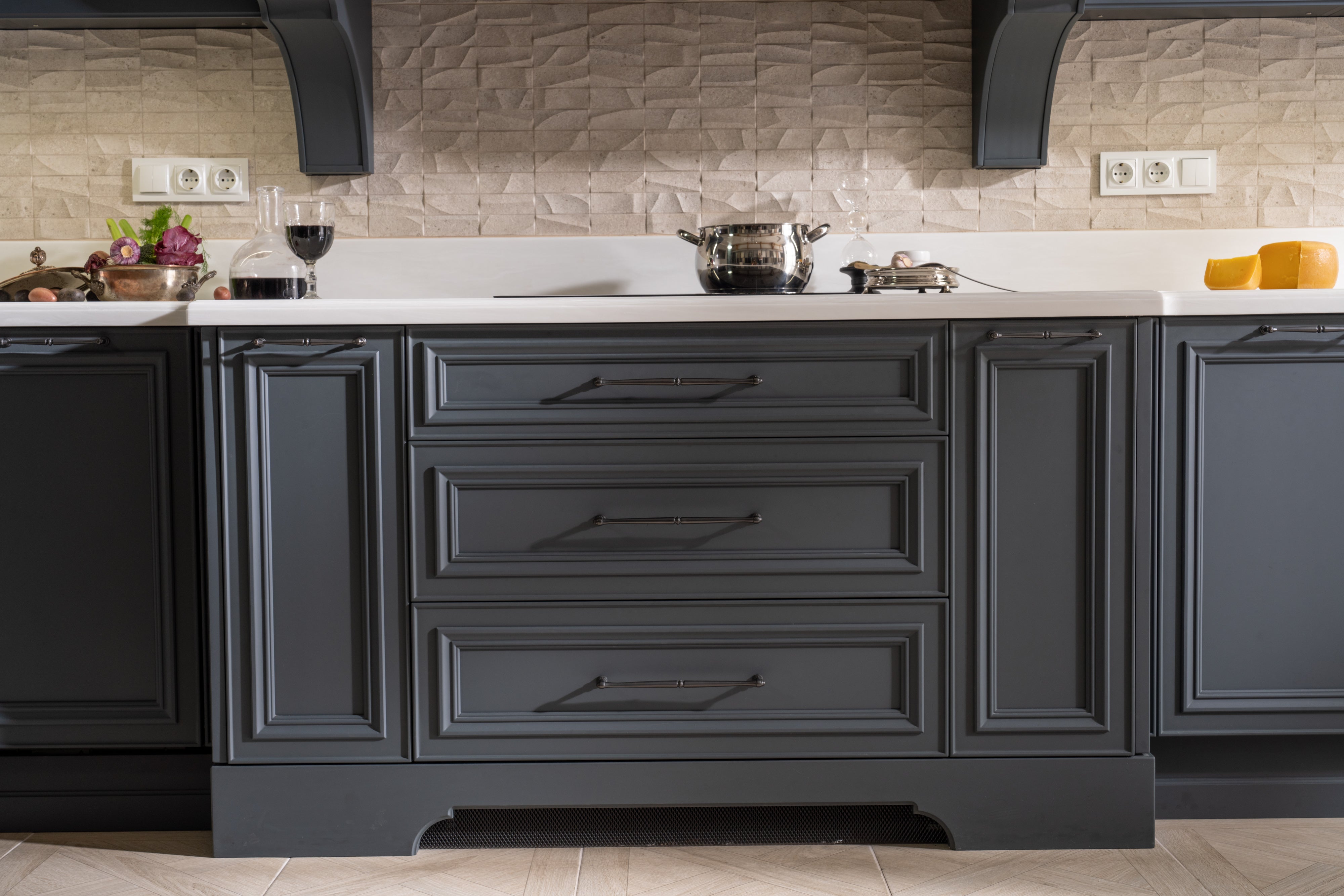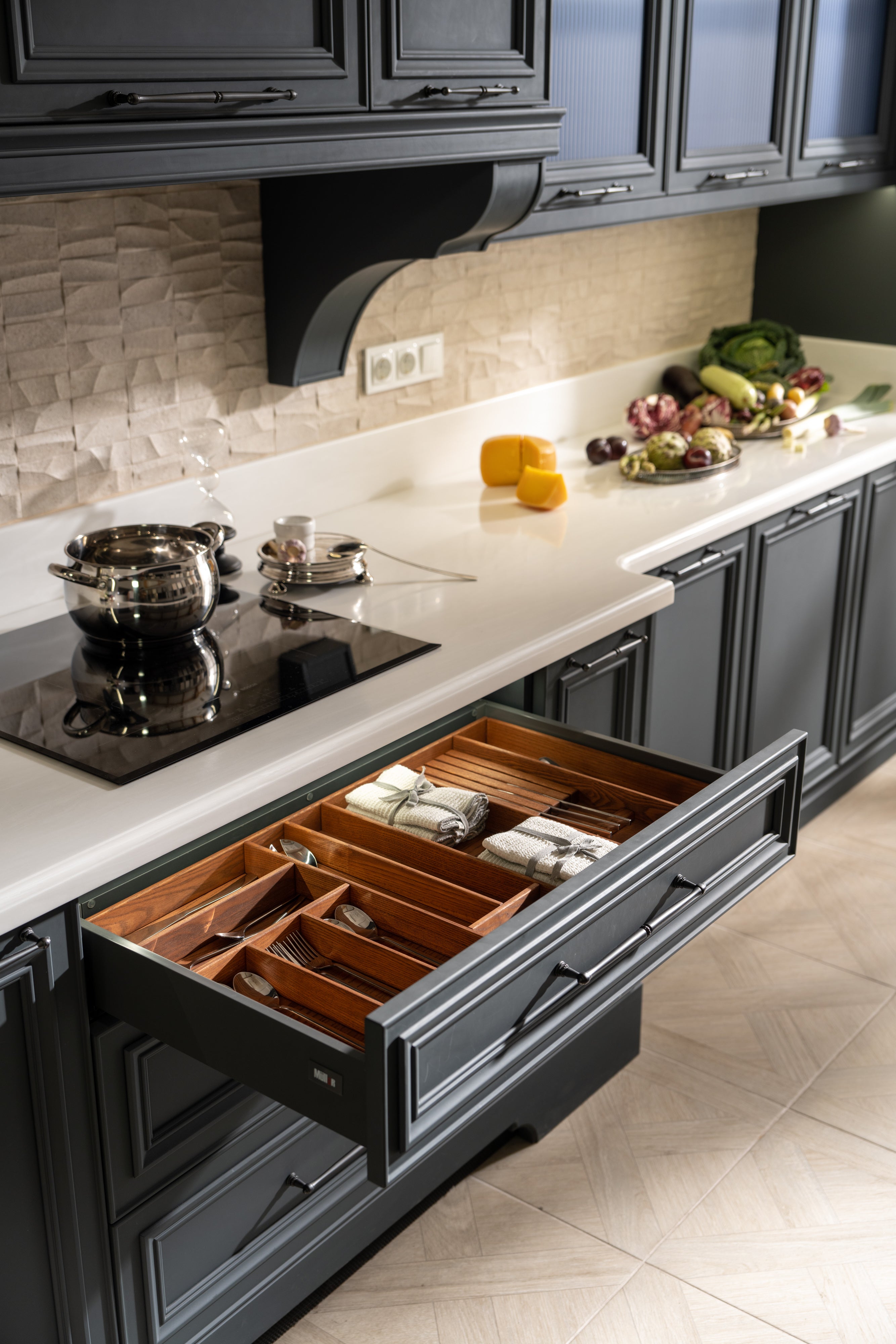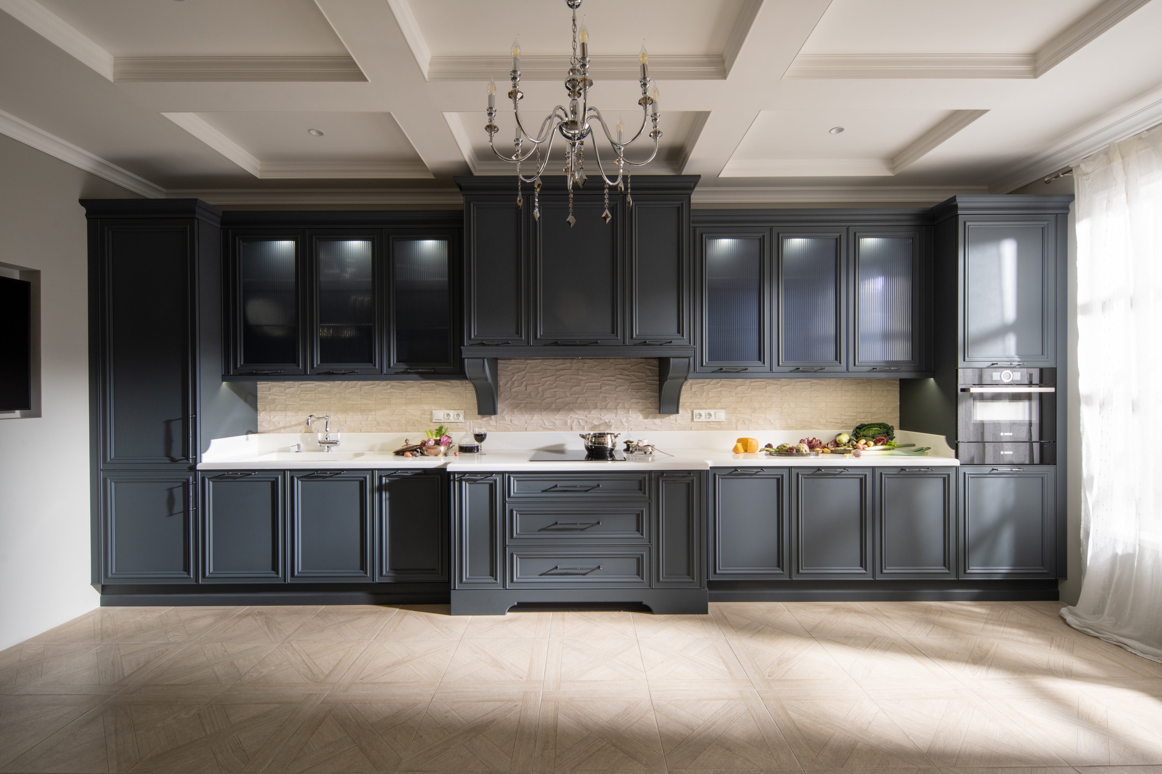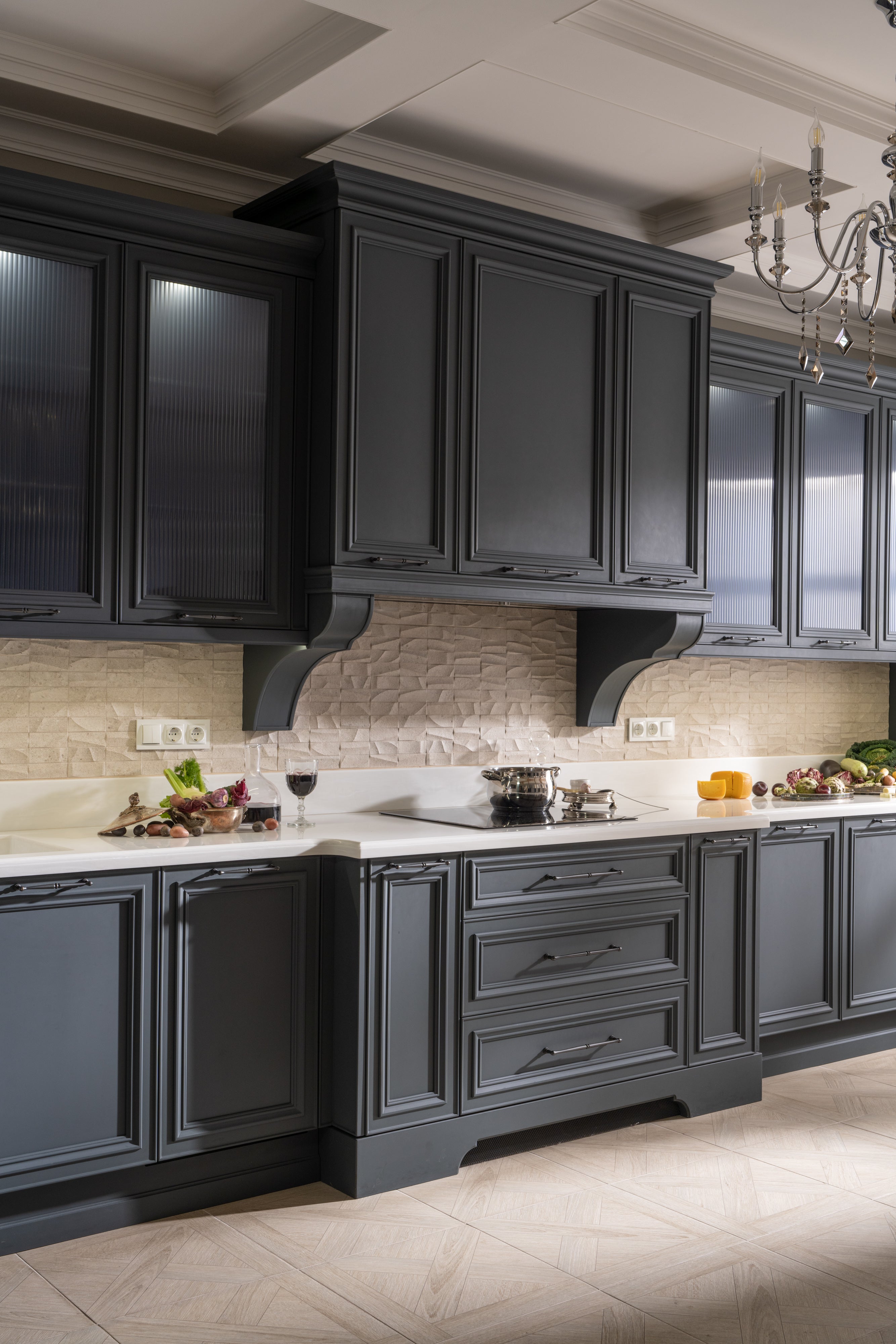 However, new "ingredients" make the classic design fresh and special. These are gray color and matte finish of the fronts, textured glass and acrylic stone countertops. The fronts are made using joinery technology. The Soft Touch coating feels warm and has the effect of a rubber surface. Glass elements add a pleasant coolness.