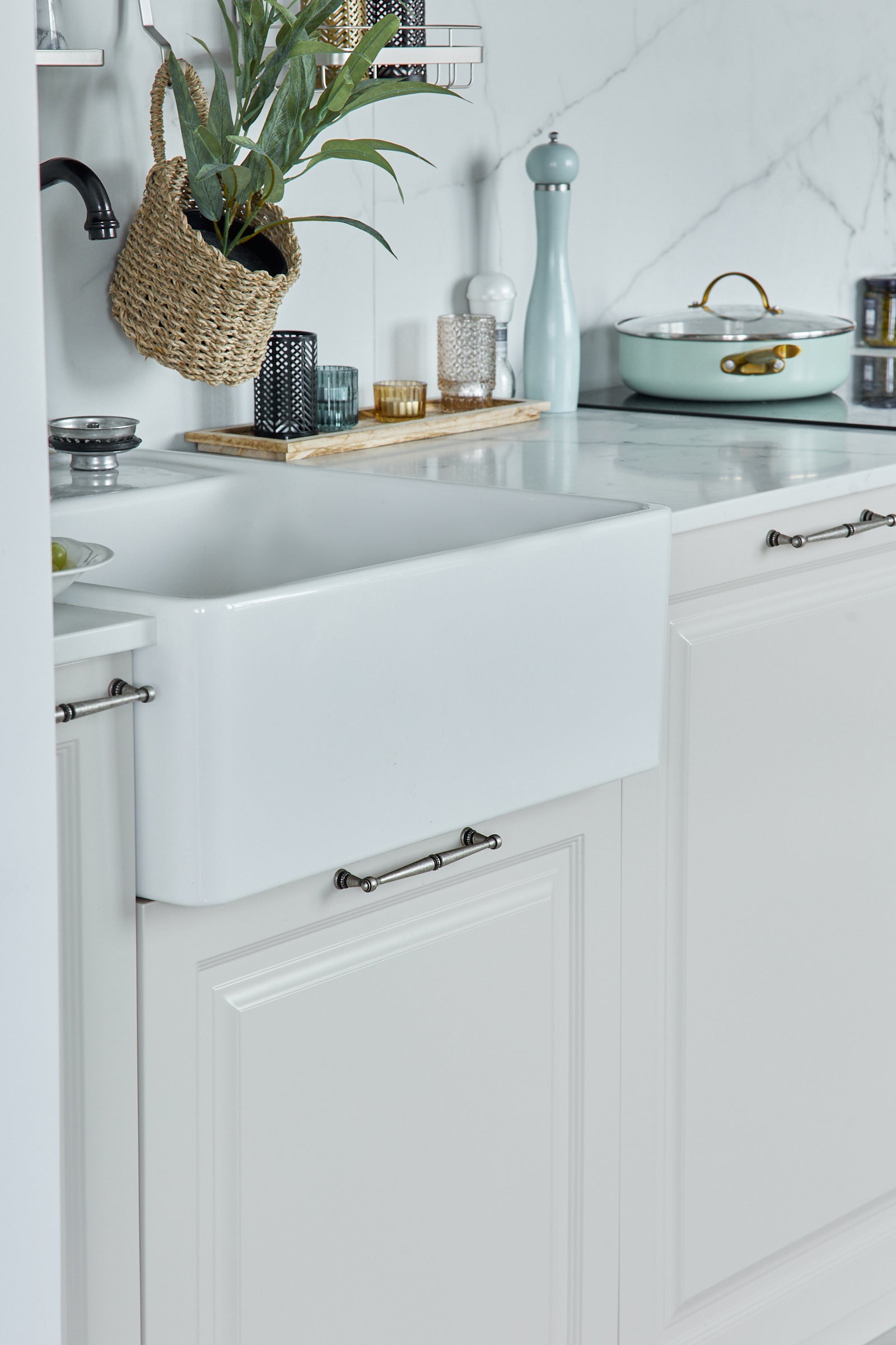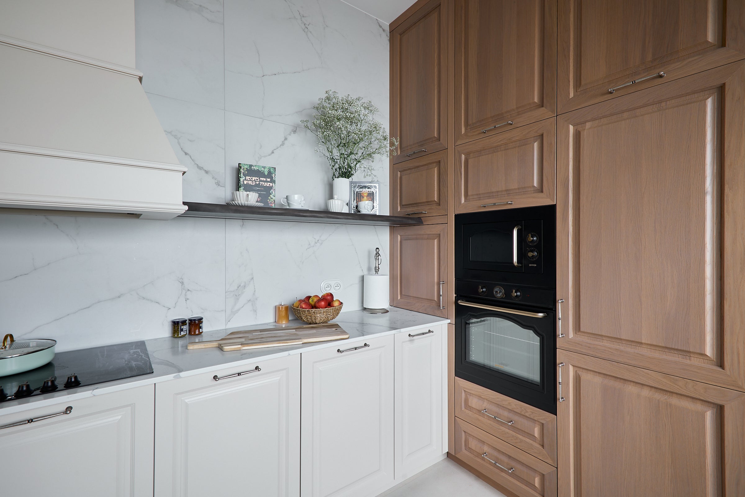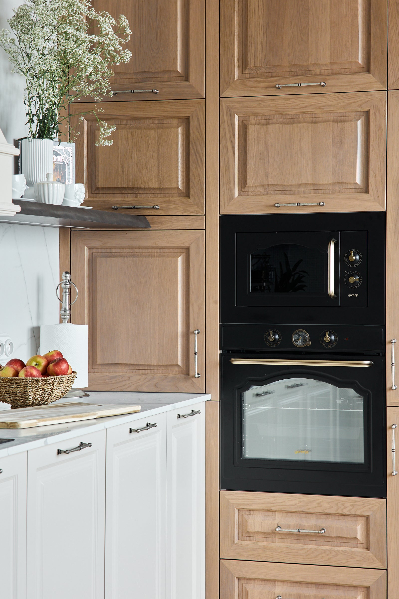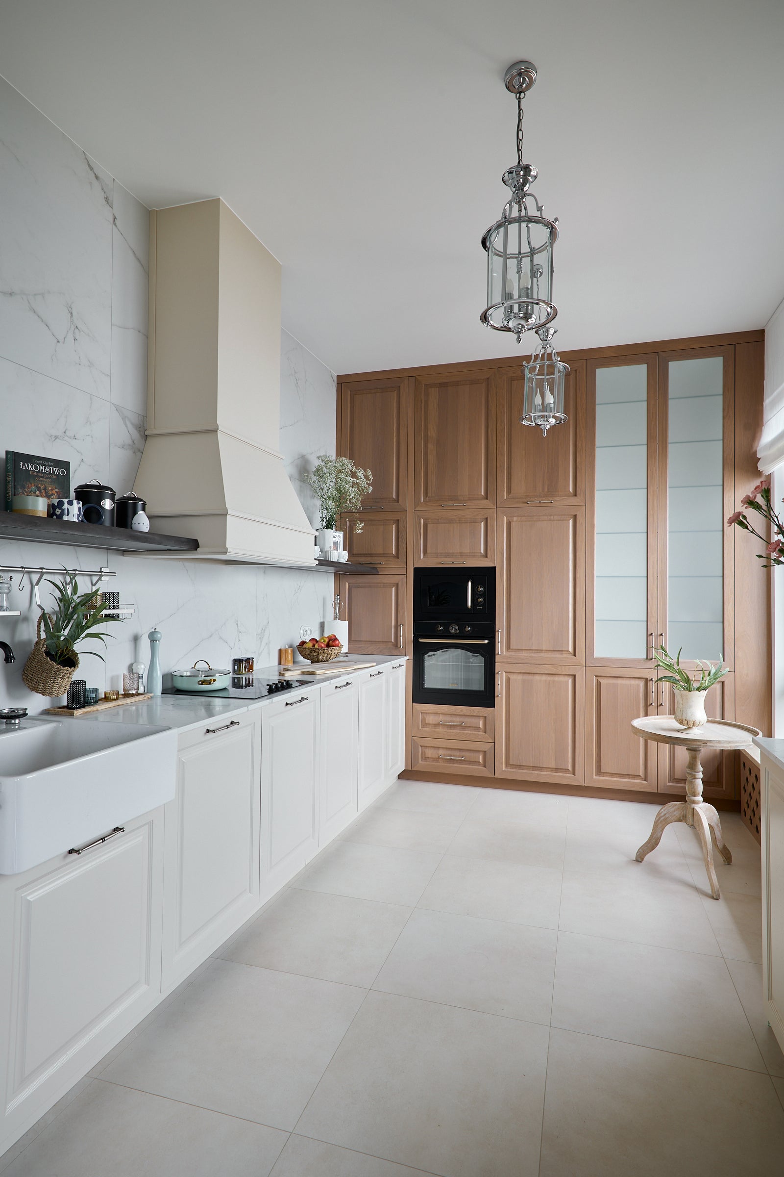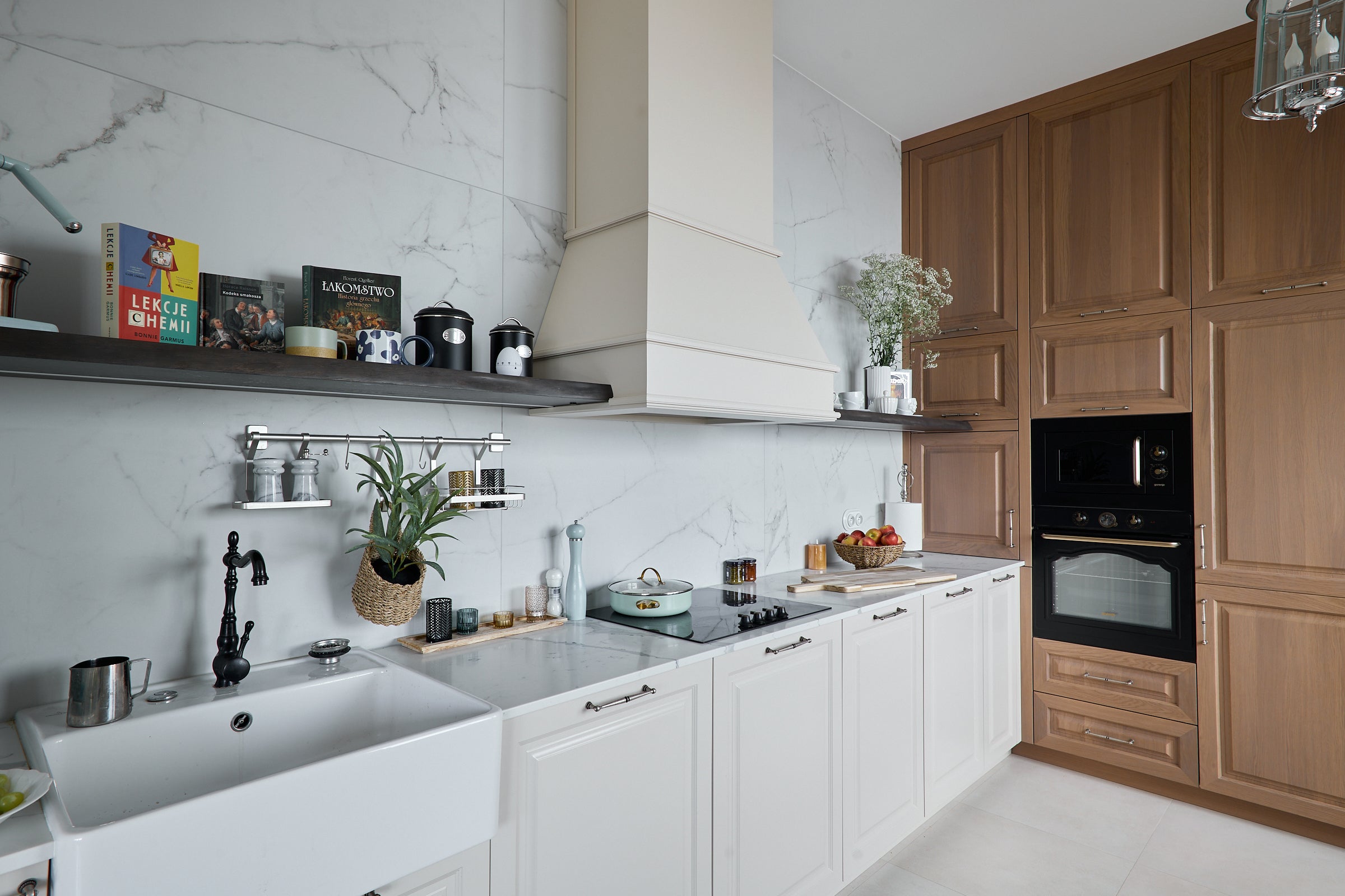Dolne fronty w kolorze klasycznej bieli wykonane zostały z lakierowanej płyty MDF, co nadaje kuchni świeżości i elegancji. Natomiast uwagę przyciągają górne fronty z frezowanego litego dębu, wybarwionego bejcą w naturalnym odcieniu – to właśnie one nadają wnętrzu wyjątkowego, ciepłego charakteru i wprowadzają do przestrzeni nutę klasycznej elegancji.