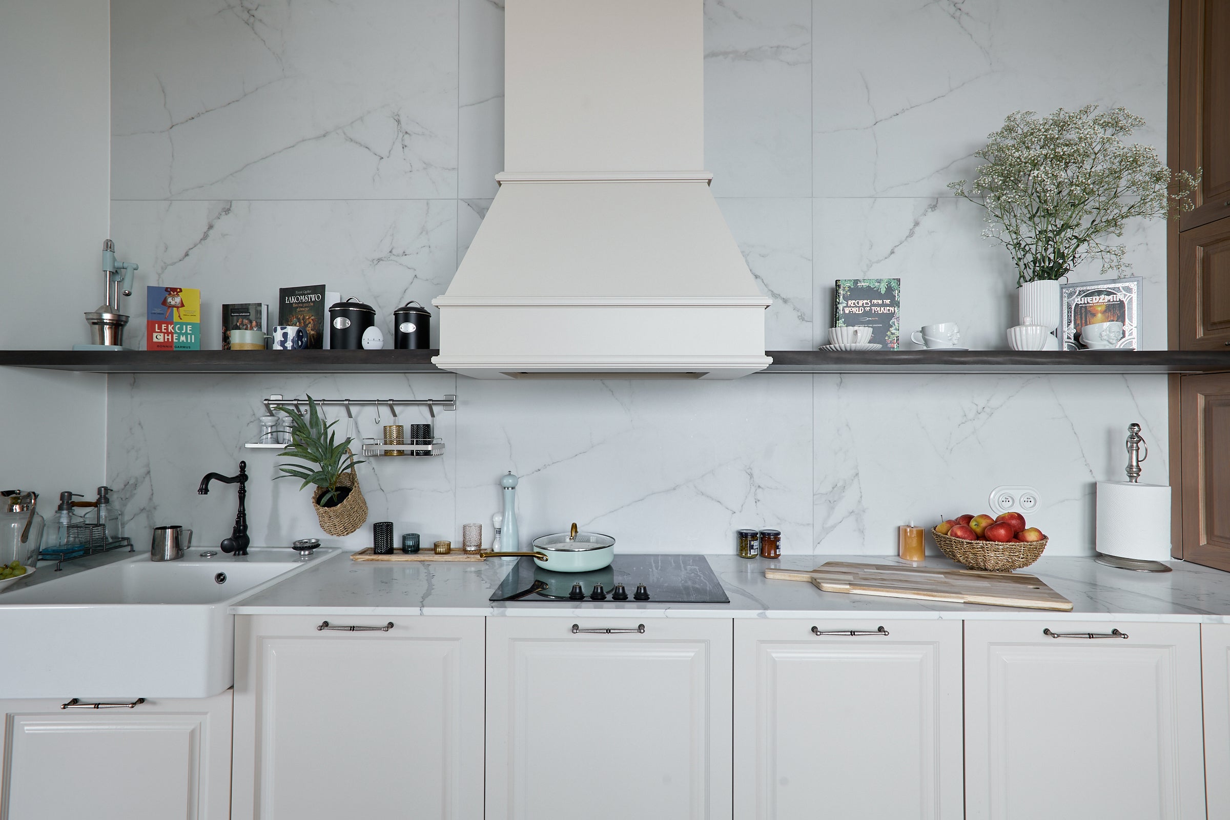 Jednym z ciekawszych rozwiązań w tym projekcie jest zabudowa okapu, wykonana z lakierowanego MDF-u oraz uzupełniona drewnianą półką z litego drewna. To połączenie nie tylko praktyczne, ale też wyjątkowo estetyczne, które pozwala na ekspozycję książek kucharskich czy ulubionych dodatków, wprowadzając do wnętrza charakter osobisty.