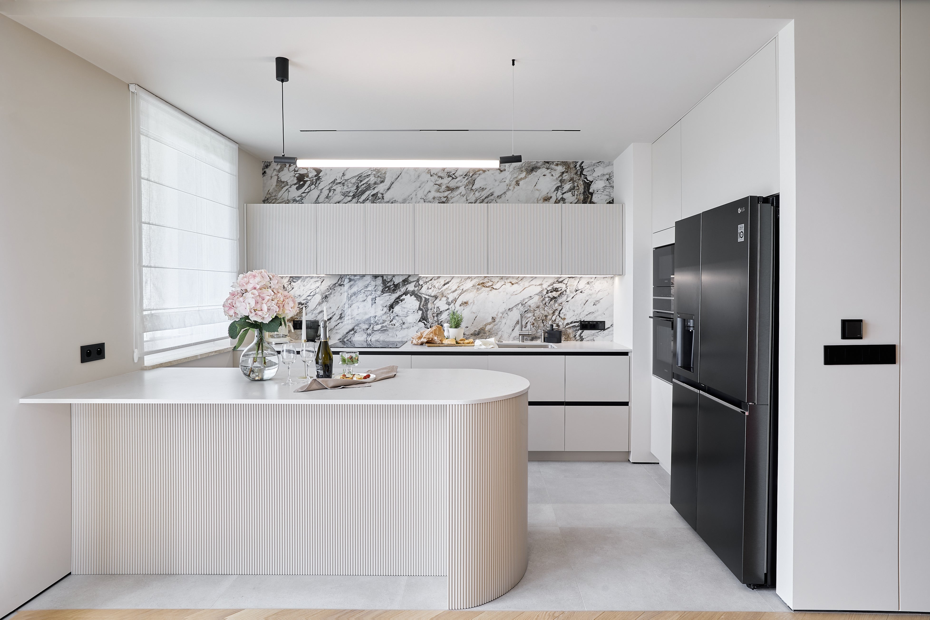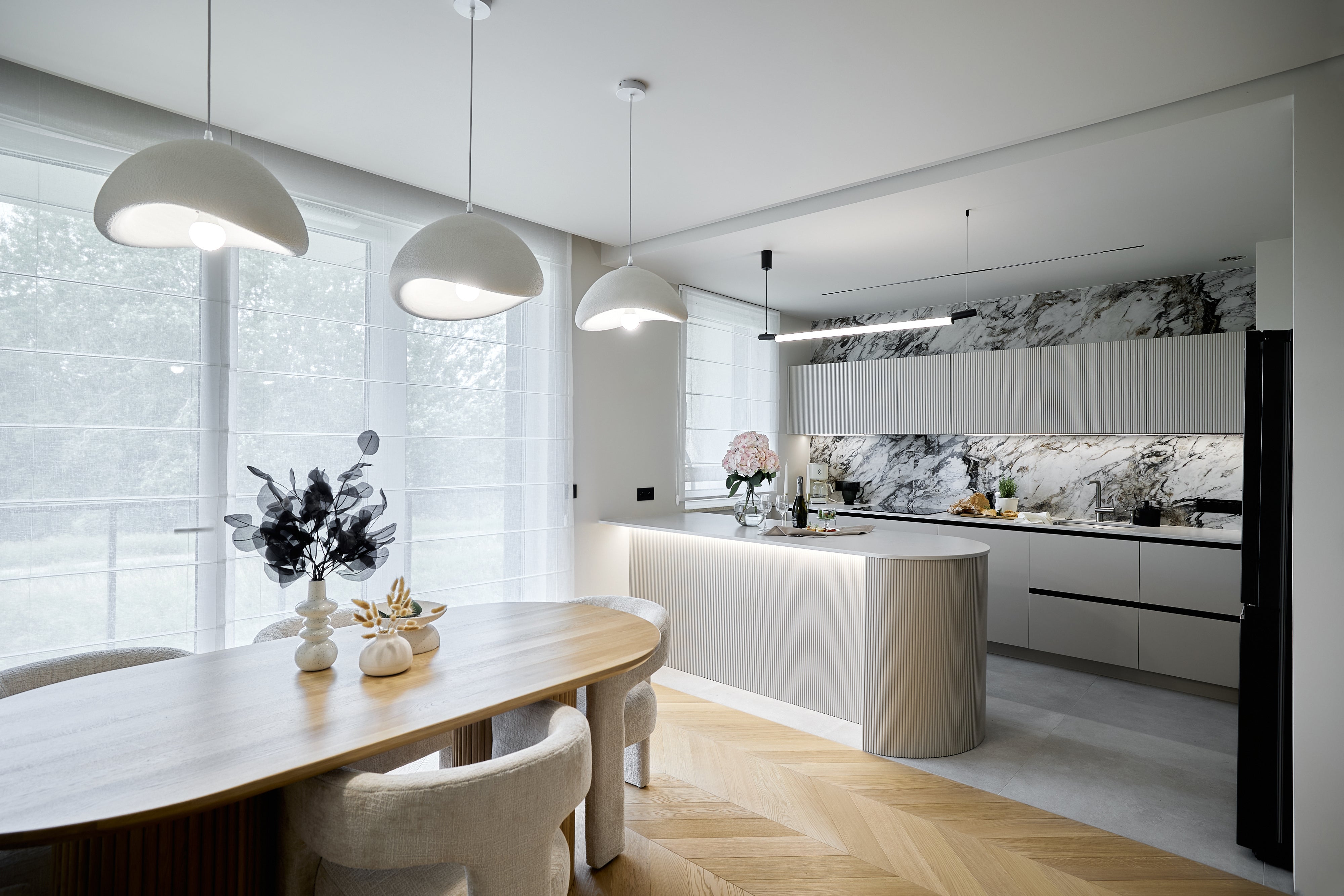 Закруглений кухонний острів гармонійно доповнює загальну концепцію інтер’єру. Його напівкругла форма і фрезерування чудово поєднуються з іншими елементами меблів.