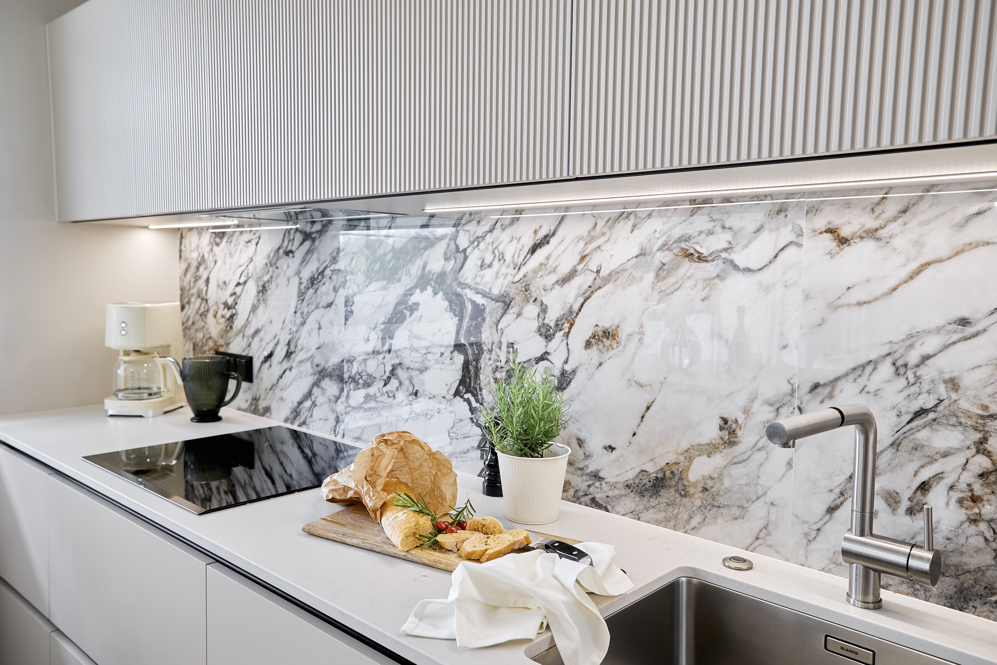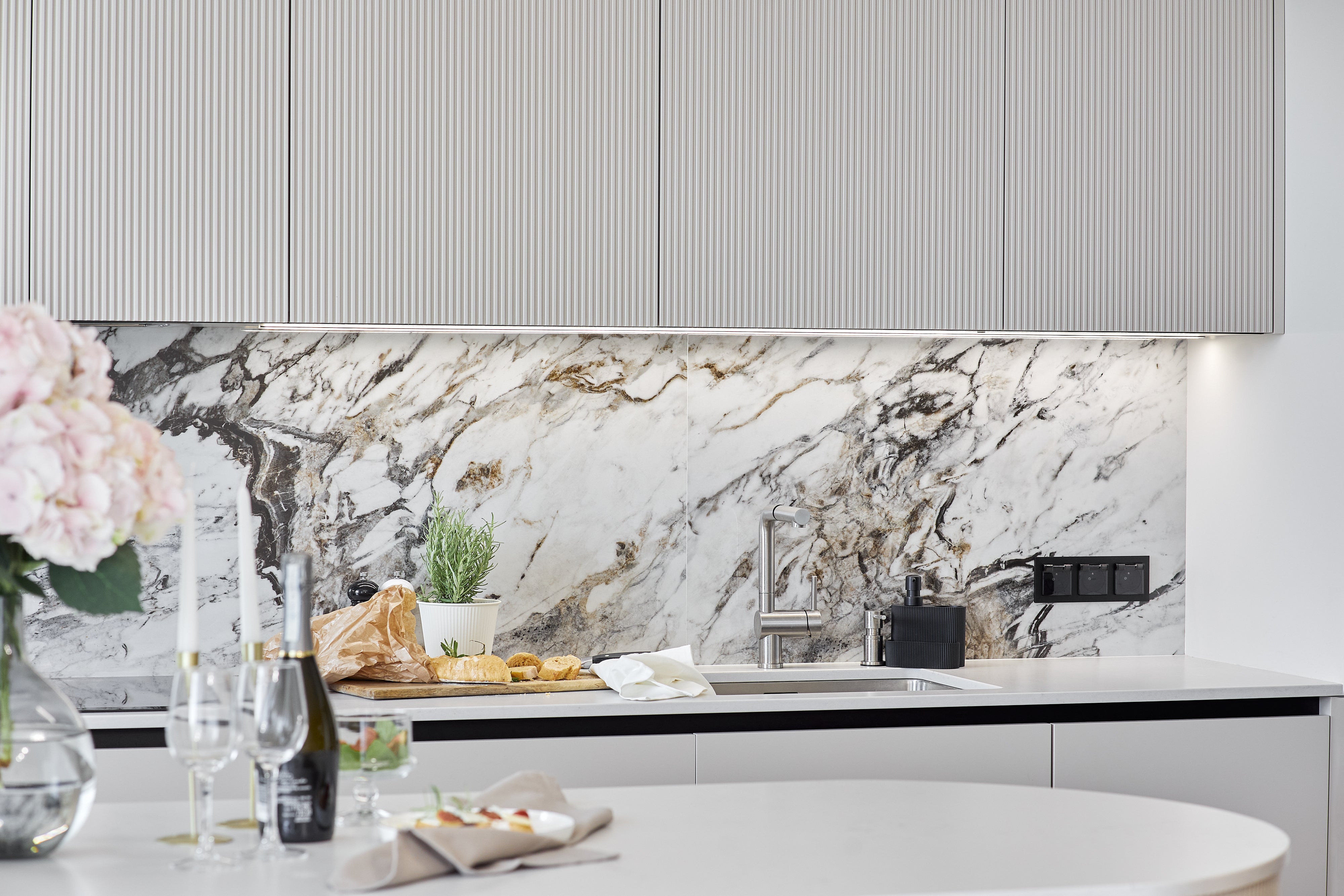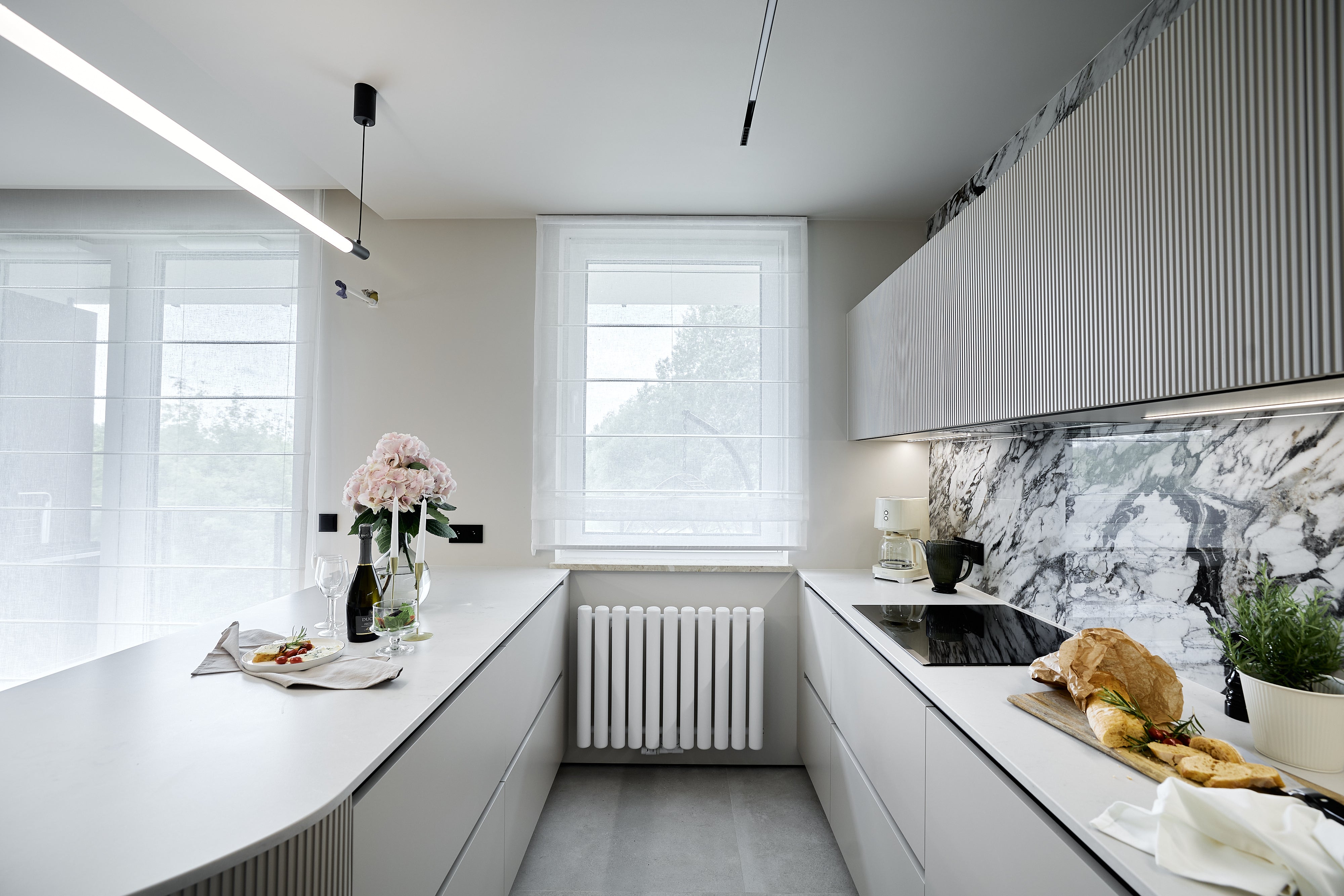На кухні використовуються два типи профілів і ручок. В одному з модулів застосований профіль Gola, який забезпечує комфортне користування шафками. У мокрій зоні використане спеціальне рішення з шипованою ручкою для зручного відкривання фасадів. Велика кількість шухляд із високоякісною фурнітурою Hettich гарантує максимальний комфорт.