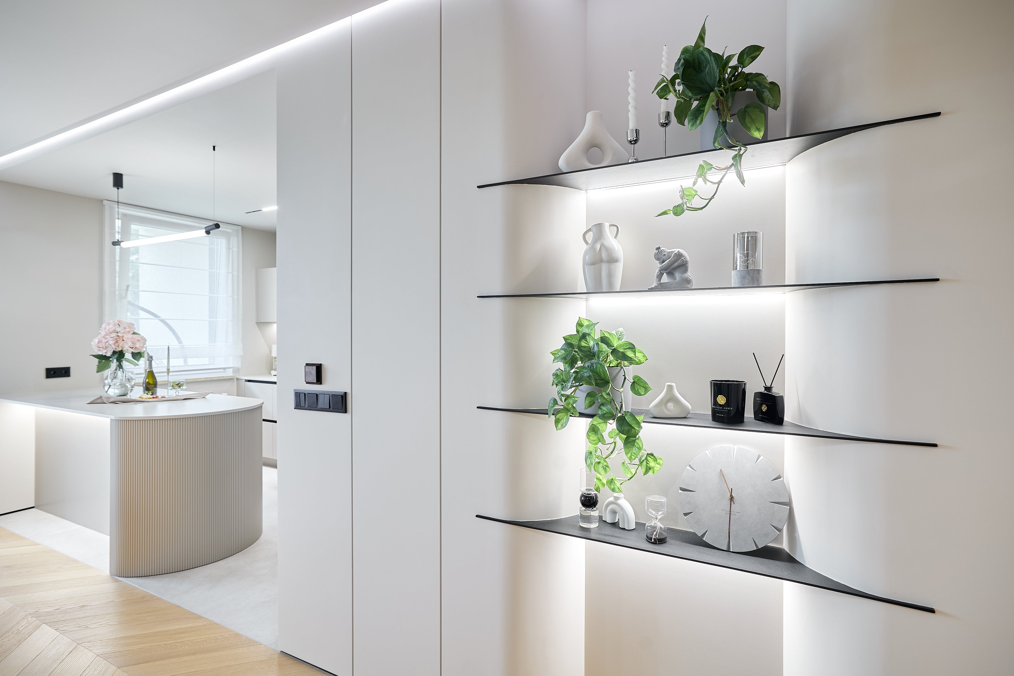 Створення полиць стало справжнім викликом, але нам вдалося досягти ідеальної товщини конструкцій, які елегантно підсвічуються LED-стрічками.