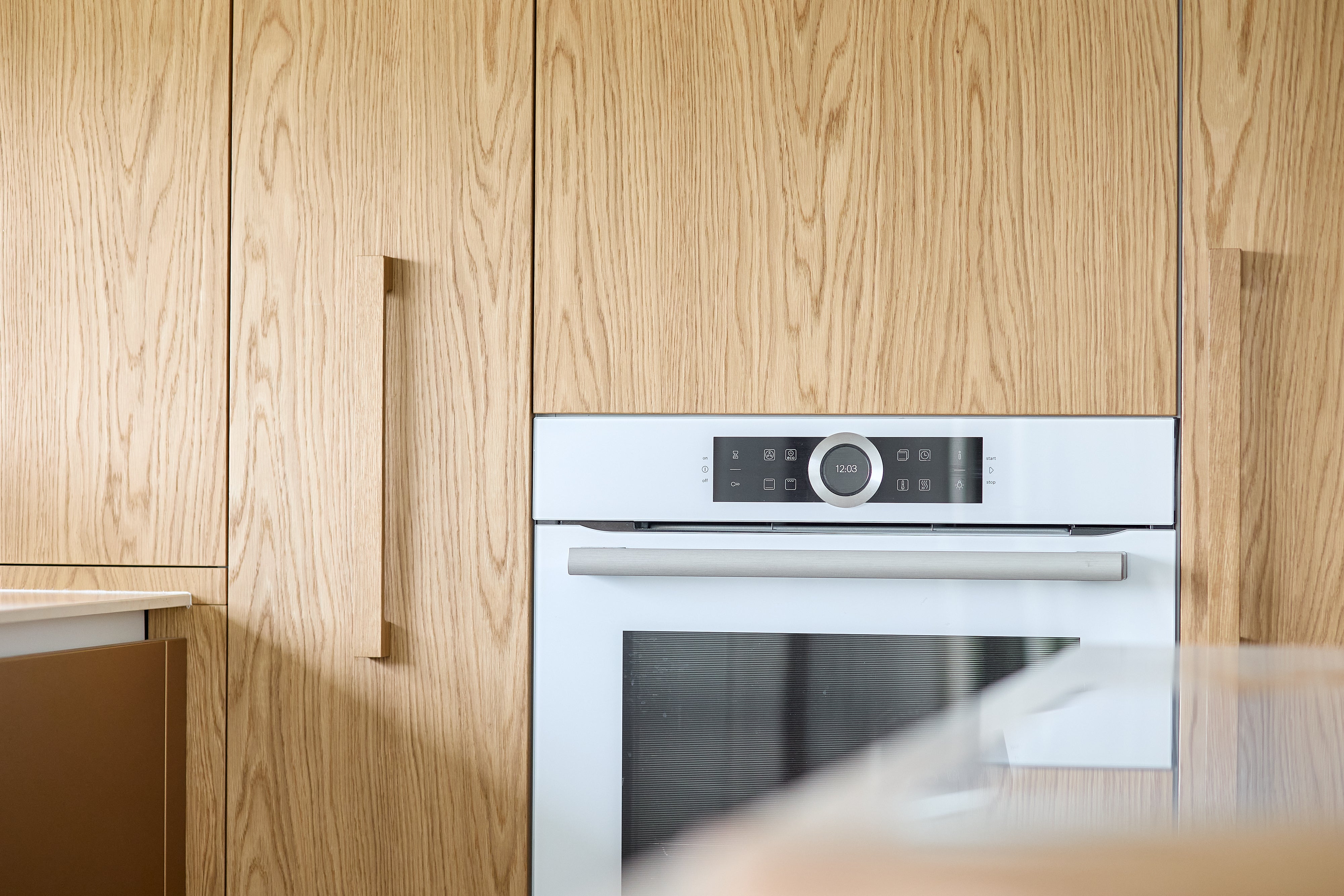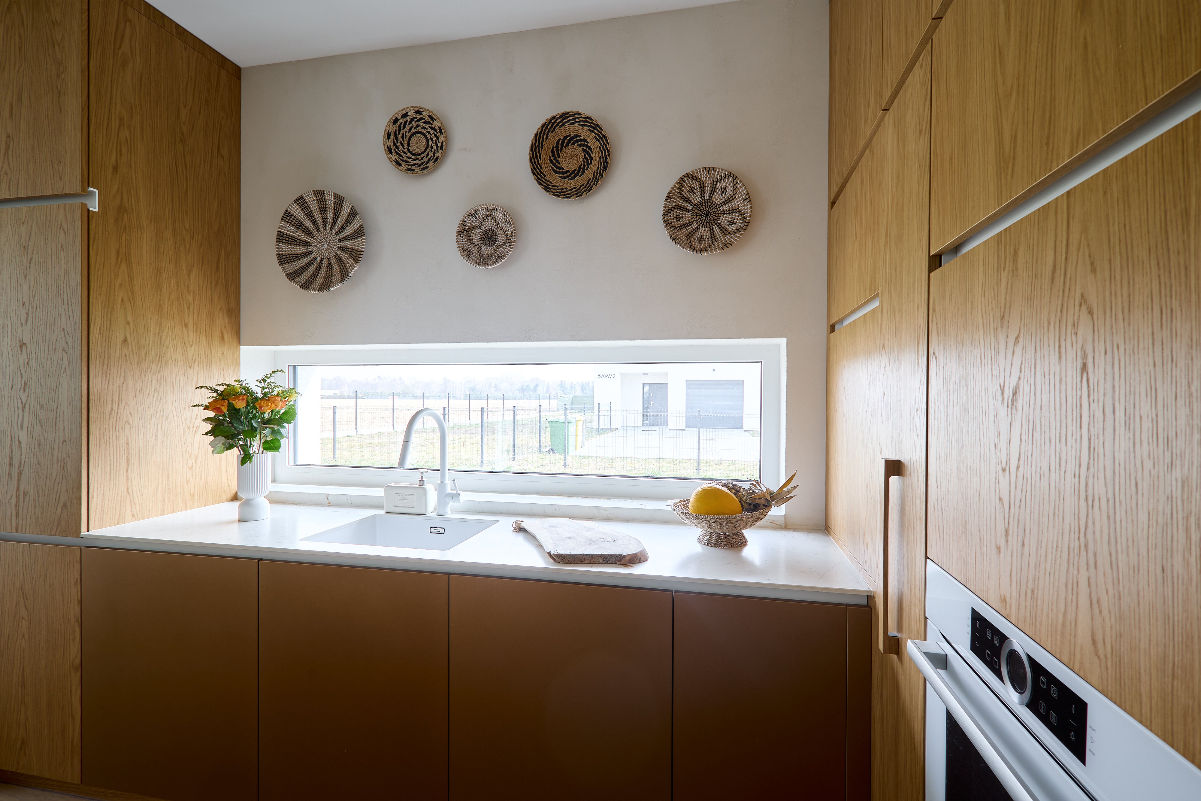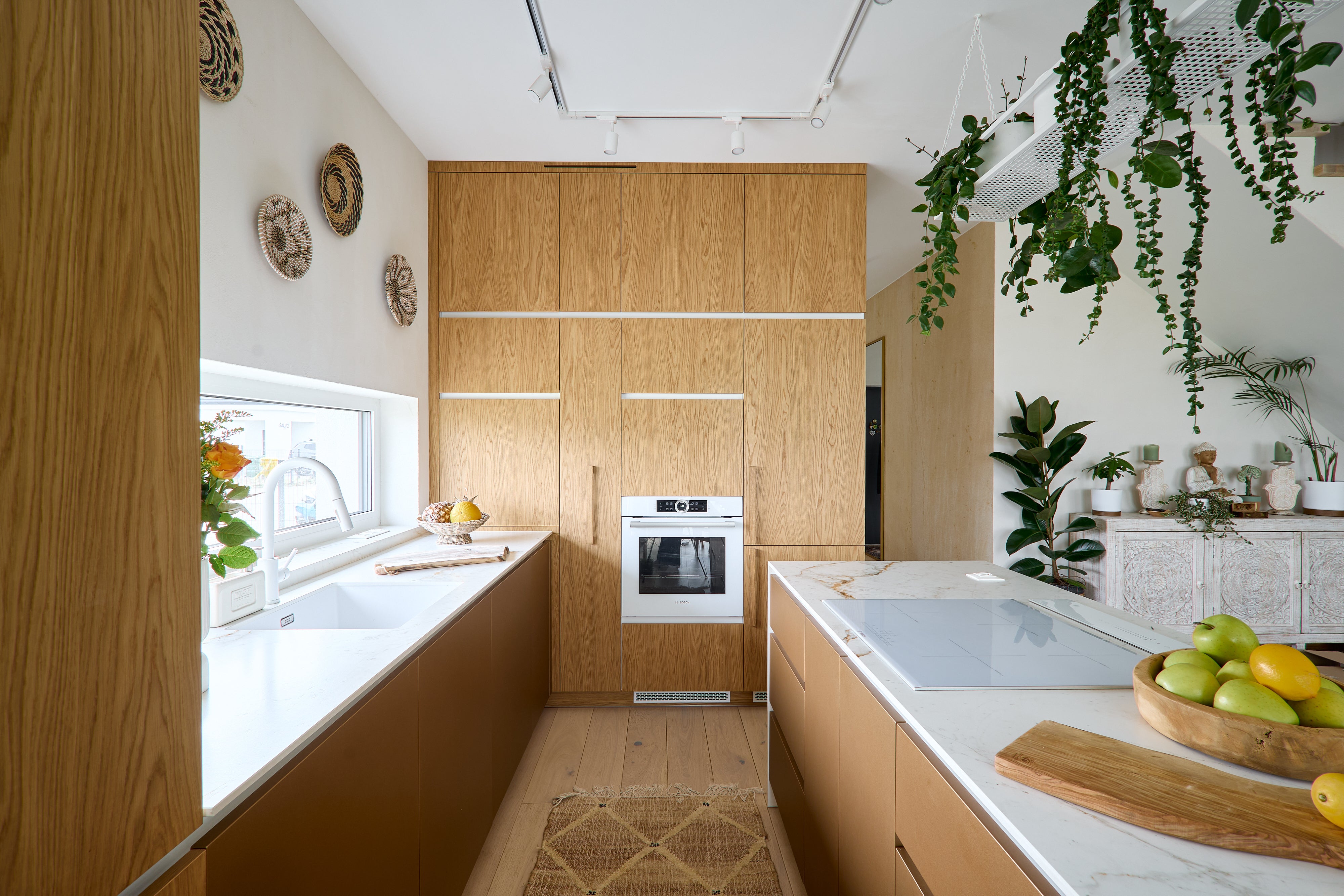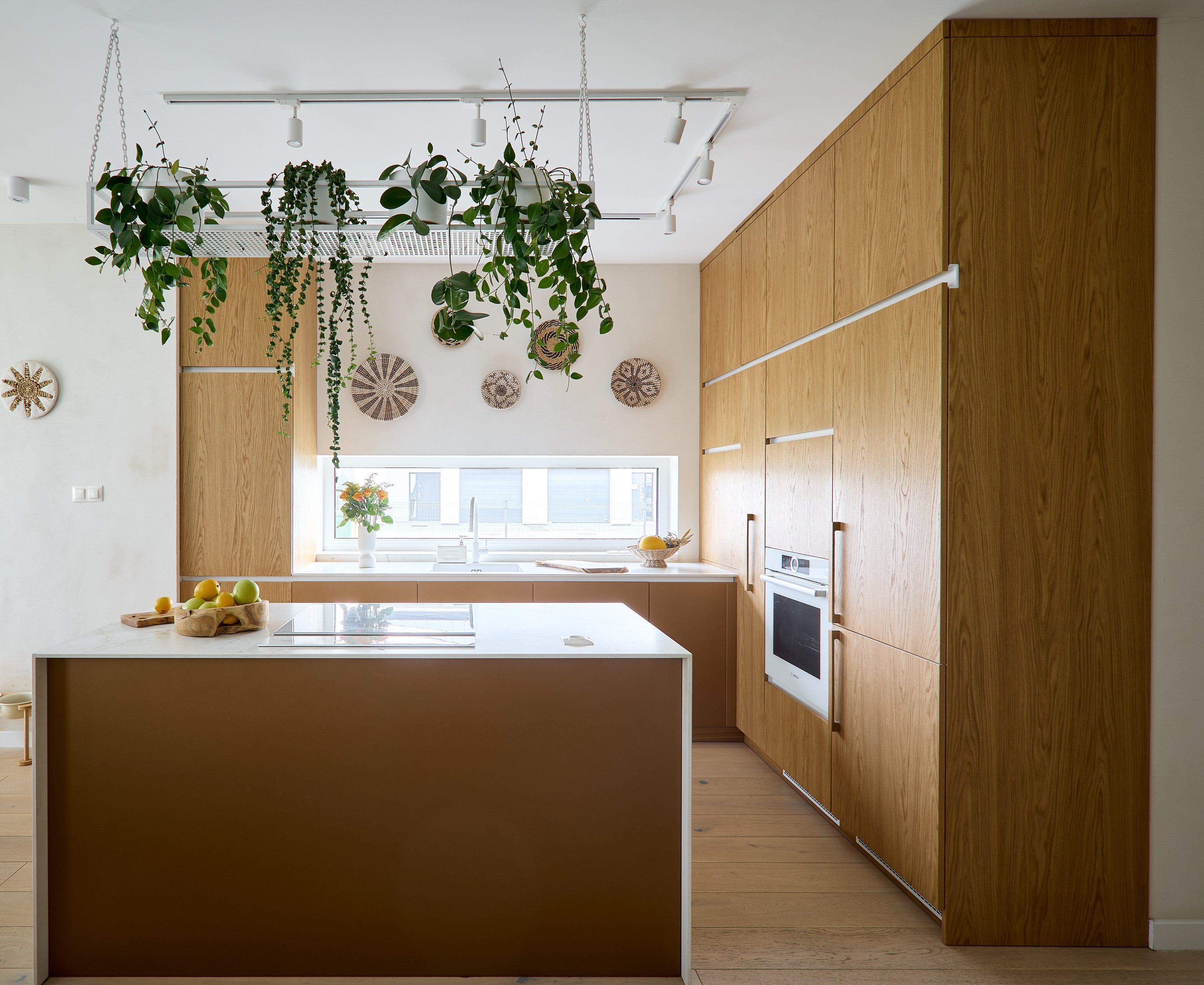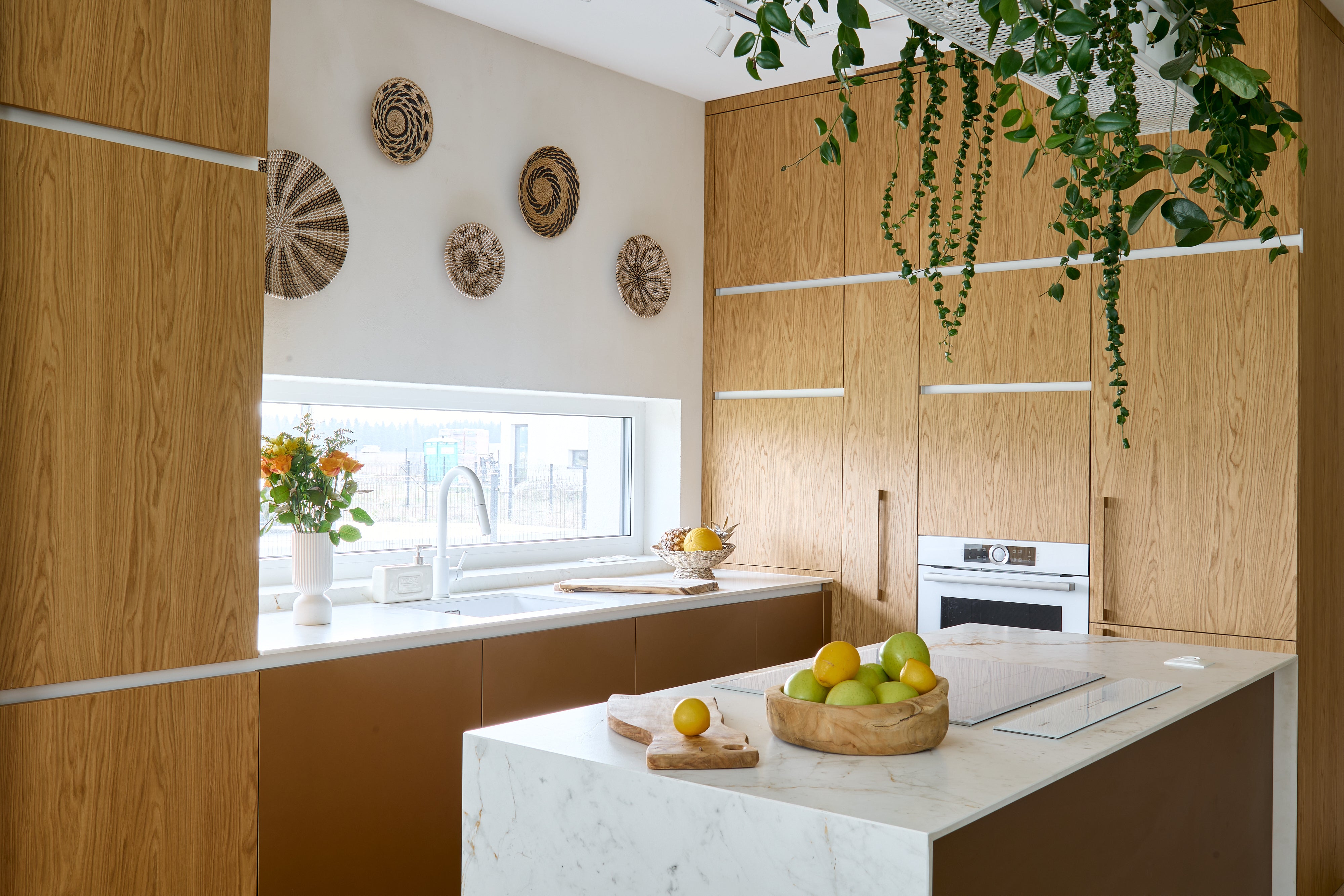 Використання натуральних матеріалів було ключовим елементом цього дизайну. Основним декоративним елементом є шафи, шпоновані натуральним дубом, які додають інтер'єру автентичності та текстури. Їхня чарівність контрастує з нижніми шафами, лакованими металевим матовим кольором, додаючи сучасного штриха всьому простору.