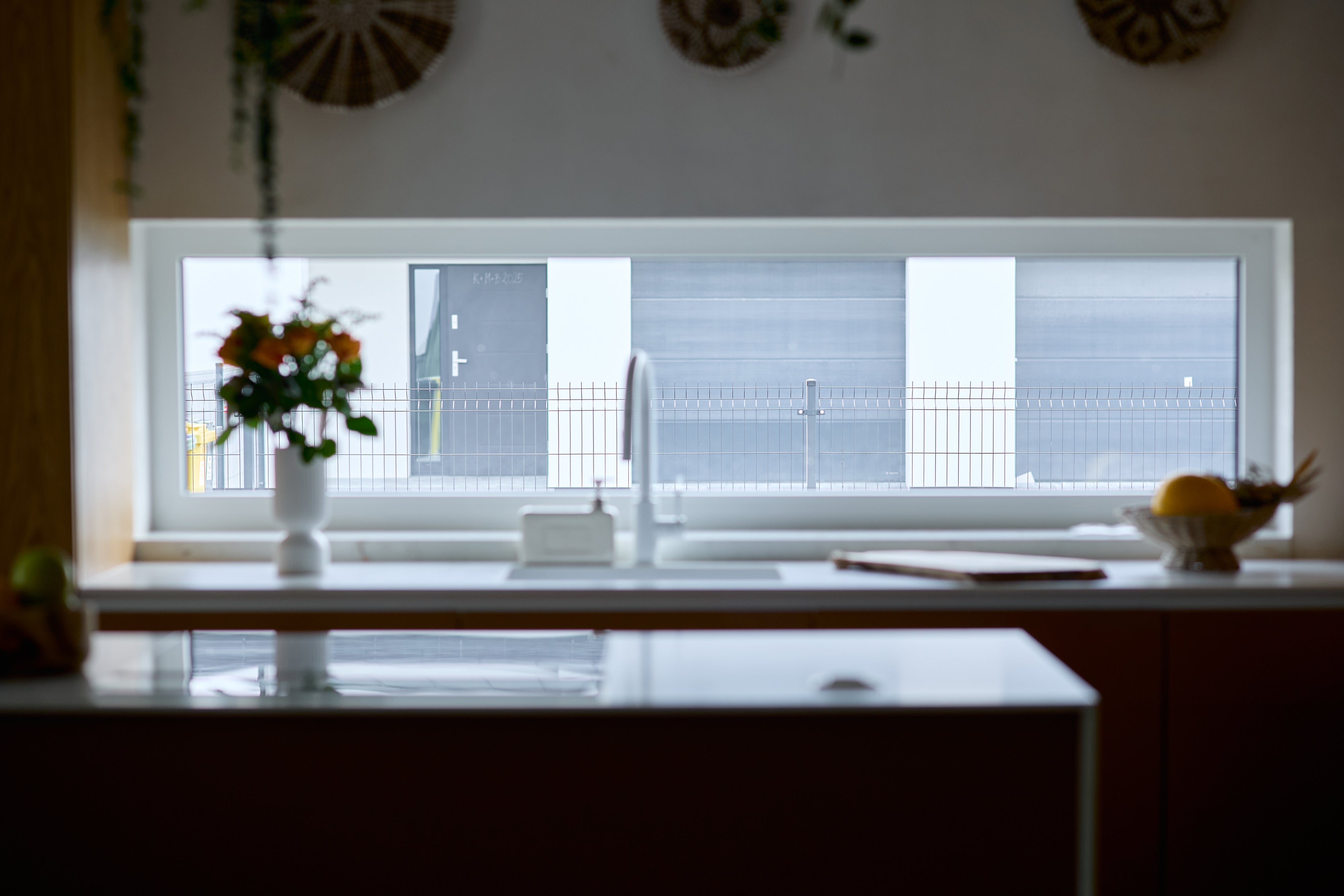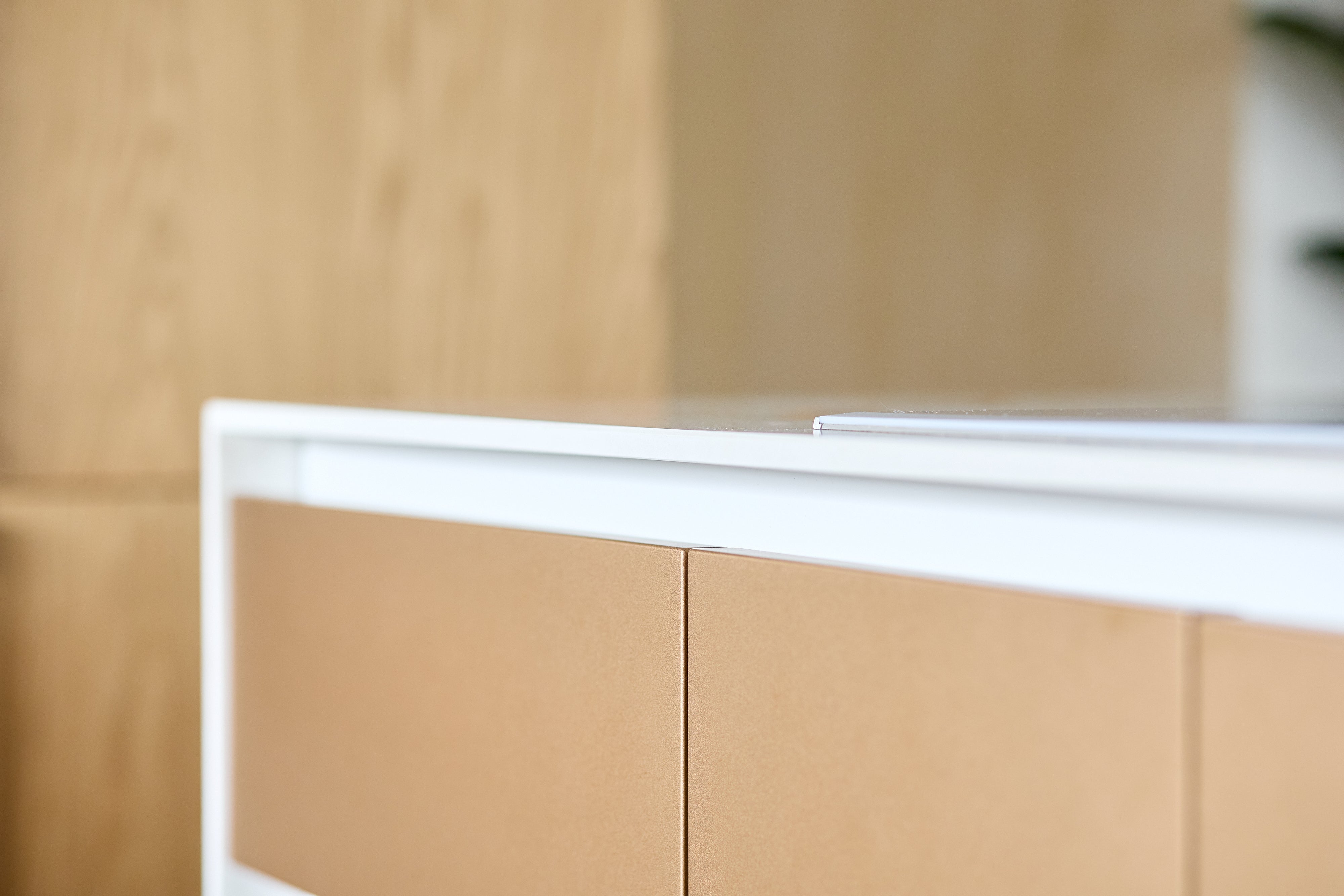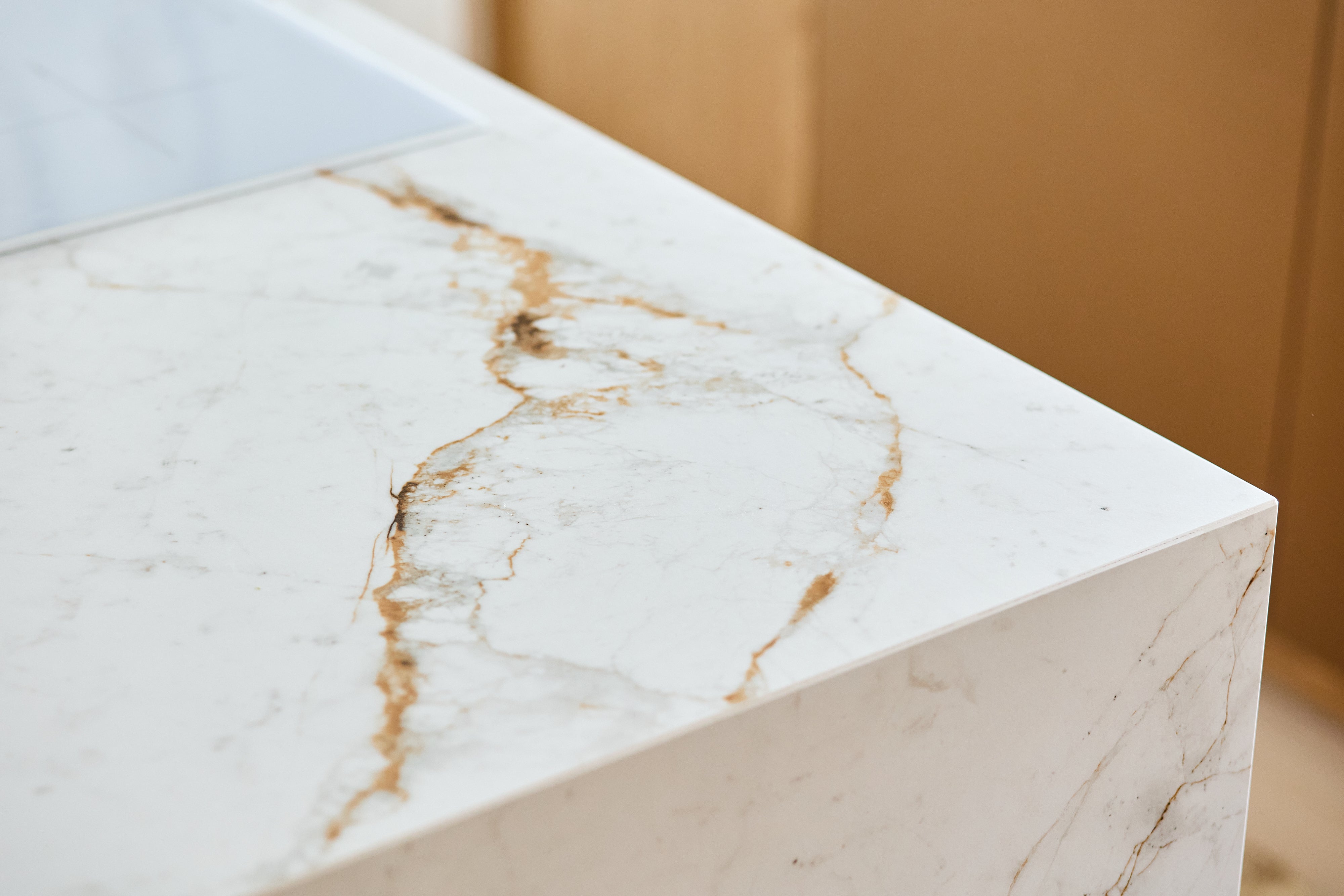 Стільниці виготовлені зі спеченого каменю Neolith Abu Dhabi – міцного, стійкого та неймовірно вражаючого матеріалу. Білі каркаси з плит Kronospan візуально освітлюють весь простір та підкреслюють чистоту ліній.