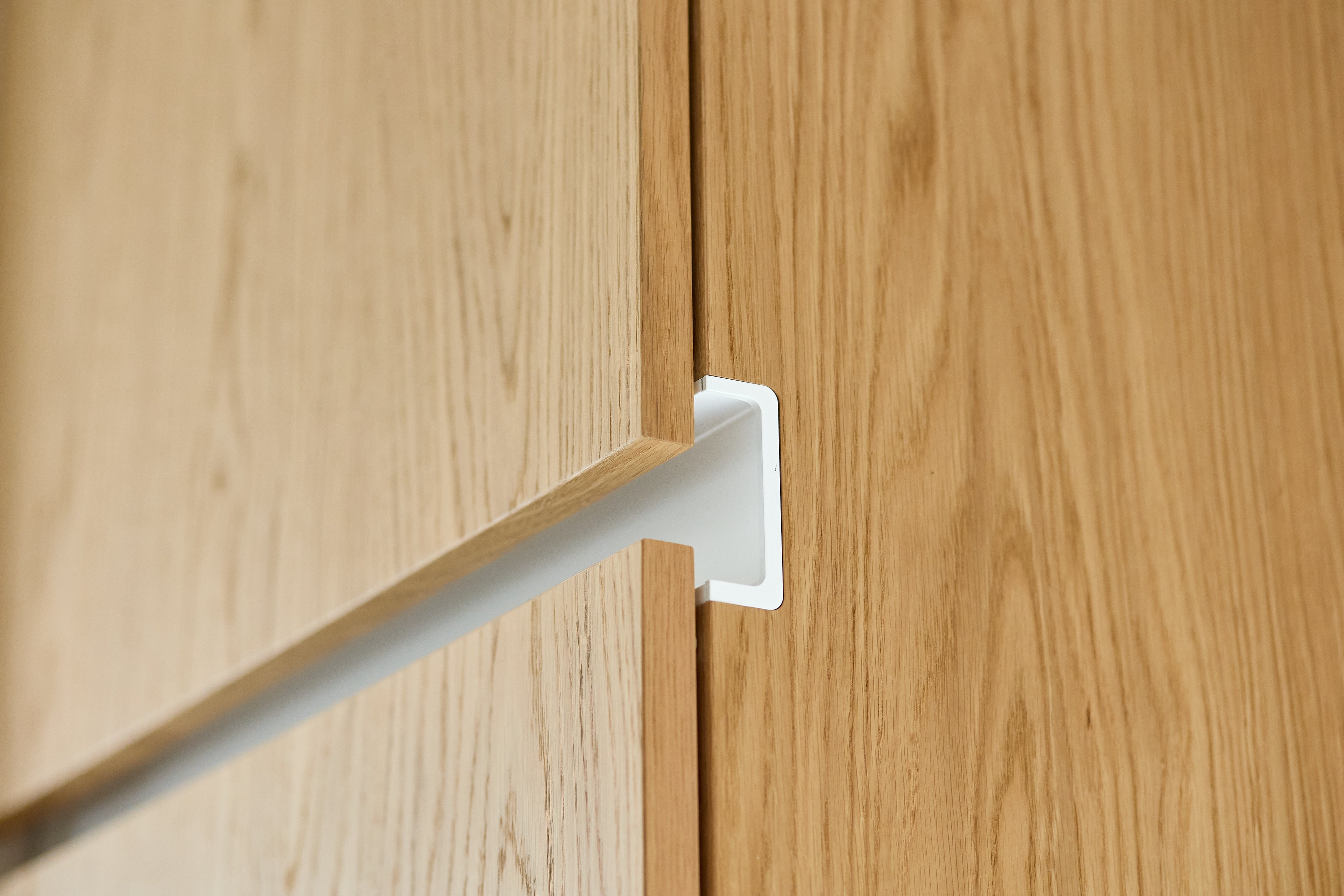 Шафа для передпокою була розроблена як продовження стилю кухні – візуально цілісної, практичної та естетично приємної. Всі елементи виготовлені з МДФ, покритого плівкою Serica, яка поєднує матове покриття з тактильною текстурою.